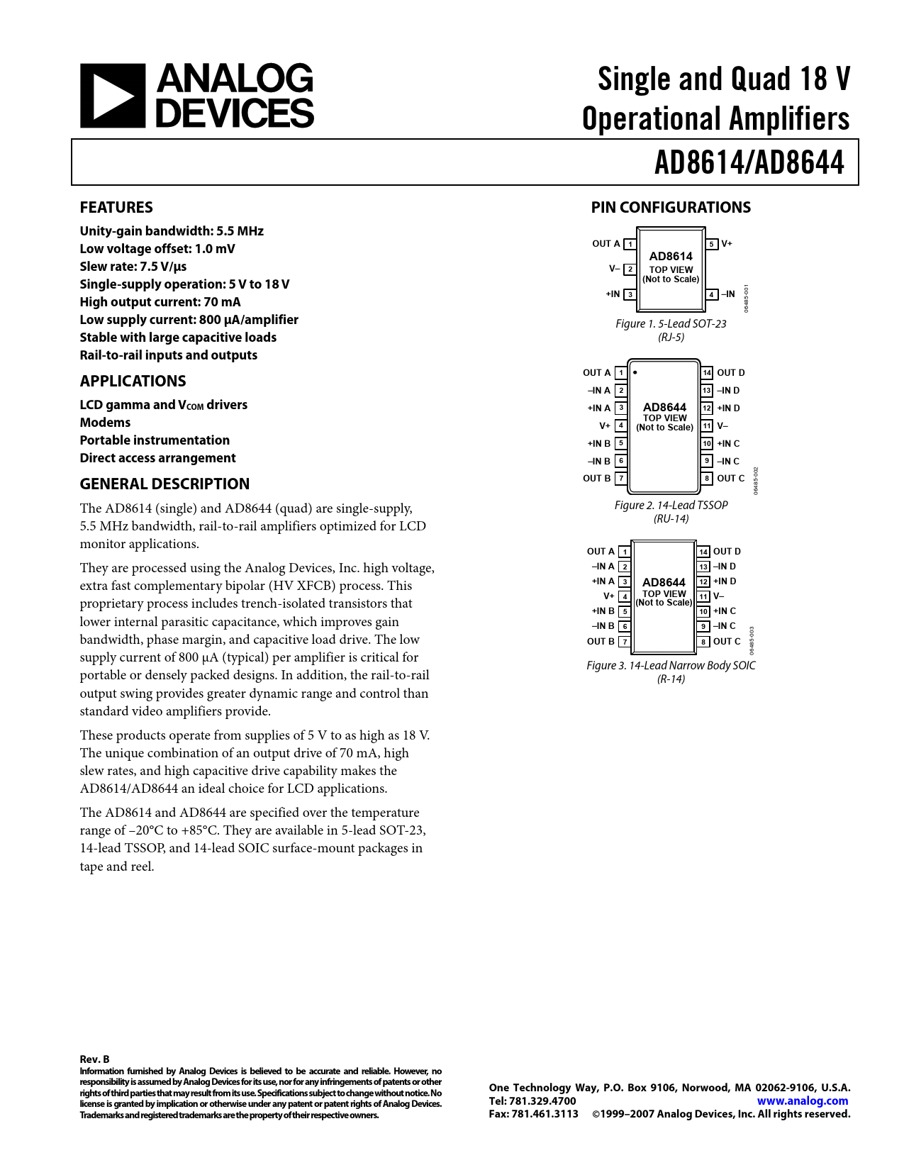 85 supply current of 800 μA (typical) per amplifier is critical for 064 Figure 3. 14-Lead Narrow Body SOIC portable or densely packed designs. In addition, the rail-to-rail (R-14) output swing provides greater dynamic range and control than standard video amplifiers provide. These products operate from supplies of 5 V to as high as 18 V. The unique combination of an output drive of 70 mA, high slew rates, and high capacitive drive capability makes the AD8614/AD8644 an ideal choice for LCD applications. The AD8614 and AD8644 are specified over the temperature range of –20°C to +85°C. They are available in 5-lead SOT-23, 14-lead TSSOP, and 14-lead SOIC surface-mount packages in tape and reel.