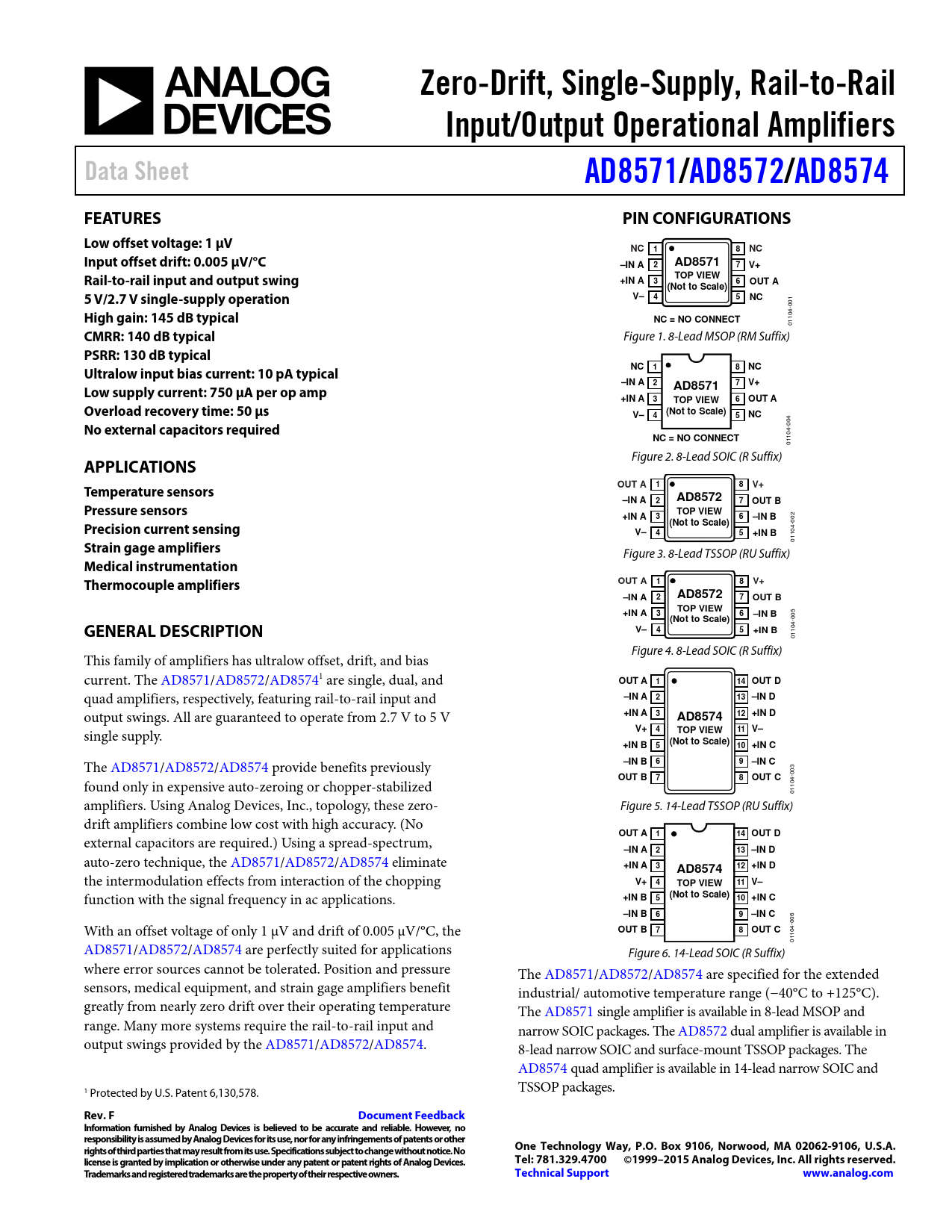 Zero-Drift, Single-Supply, Rail-to-Rail. Input/Output Operational Amplifiers. Data Sheet. AD8571/. AD8572/. AD8574. FEATURES