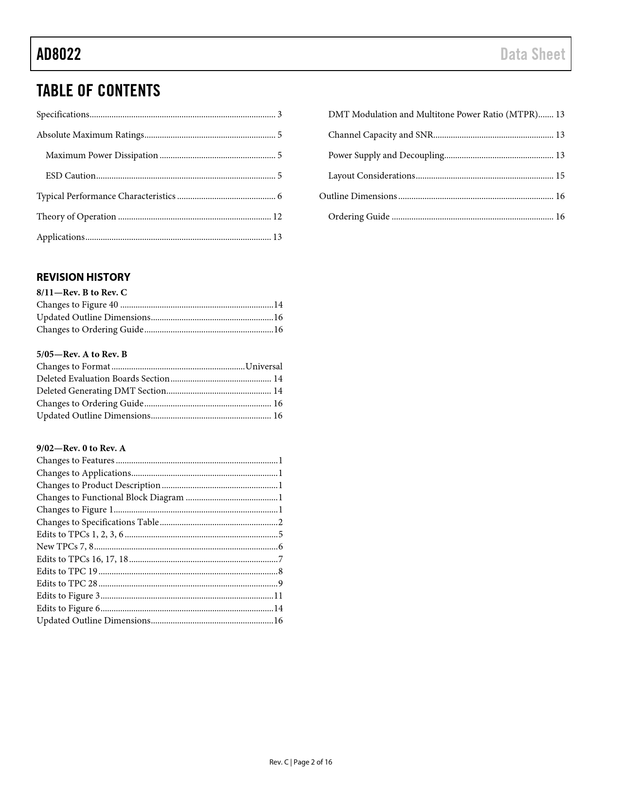 AD8022. Data Sheet. TABLE OF CONTENTS. REVISION HISTORY. 8/11—Rev. B to Rev. C. 5/05—Rev. A to Rev. B. 9/02—Rev. 0 to Rev. A