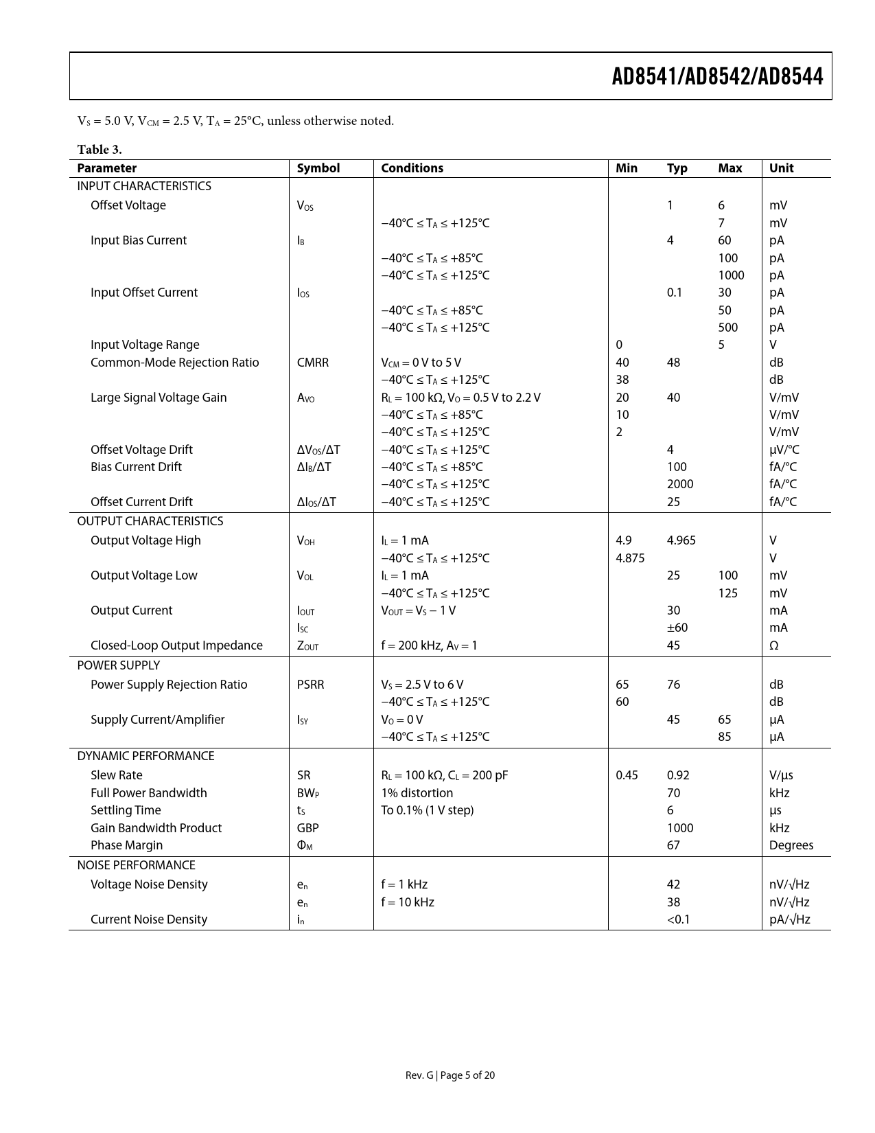 AD8541/AD8542/AD8544 VS = 5.0 V, VCM = 2.5 V, TA = 25°C, unless otherwise noted. Table 3. ParameterSymbolConditionsMinTypMaxUnit INPUT CHARACTERISTICS Offset Voltage VOS 1 6 mV −40°C ≤ TA ≤ +125°C 7 mV Input Bias Current IB 4 60 pA −40°C ≤ TA ≤ +85°C 100 pA −40°C ≤ TA ≤ +125°C 1000 pA Input Offset Current IOS 0.1 30 pA −40°C ≤ TA ≤ +85°C 50 pA −40°C ≤ TA ≤ +125°C 500 pA Input Voltage Range 0 5 V Common-Mode Rejection Ratio CMRR VCM = 0 V to 5 V 40 48 dB −40°C ≤ TA ≤ +125°C 38 dB Large Signal Voltage Gain AVO RL = 100 kΩ, VO = 0.5 V to 2.2 V 20 40 V/mV −40°C ≤ TA ≤ +85°C 10 V/mV −40°C ≤ TA ≤ +125°C 2 V/mV Offset Voltage Drift ΔVOS/ΔT −40°C ≤ TA ≤ +125°C 4 μV/°C Bias Current Drift ΔIB/ΔT −40°C ≤ TA ≤ +85°C 100 fA/°C −40°C ≤ TA ≤ +125°C 2000 fA/°C Offset Current Drift ΔIOS/ΔT −40°C ≤ TA ≤ +125°C 25 fA/°C OUTPUT CHARACTERISTICS Output Voltage High VOH IL = 1 mA 4.9 4.965 V −40°C ≤ TA ≤ +125°C 4.875 V Output Voltage Low VOL IL = 1 mA 25 100 mV −40°C ≤ TA ≤ +125°C 125 mV Output Current IOUT VOUT = VS − 1 V 30 mA ISC ±60 mA Closed-Loop Output Impedance ZOUT f = 200 kHz, AV = 1 45 Ω POWER SUPPLY Power Supply Rejection Ratio PSRR VS = 2.5 V to 6 V 65 76 dB −40°C ≤ TA ≤ +125°C 60 dB Supply Current/Amplifier ISY VO = 0 V 45 65 μA −40°C ≤ TA ≤ +125°C 85 μA DYNAMIC PERFORMANCE Slew Rate SR RL = 100 kΩ, CL = 200 pF 0.45 0.92 V/μs Full Power Bandwidth BWP 1% distortion 70 kHz Settling Time tS To 0.1% (1 V step) 6 μs Gain Bandwidth Product GBP 1000 kHz Phase Margin ΦM 67 Degrees NOISE PERFORMANCE Voltage Noise Density en f = 1 kHz 42 nV/√Hz en f = 10 kHz 38 nV/√Hz Current Noise Density in <0.1 pA/√Hz Rev. G | Page 5 of 20 Document Outline FEATURES APPLICATIONS GENERAL DESCRIPTION PIN CONFIGURATIONS TABLE OF CONTENTS REVISION HISTORY SPECIFICATIONS ELECTRICAL CHARACTERISTICS ABSOLUTE MAXIMUM RATINGS THERMAL RESISTANCE ESD CAUTION TYPICAL PERFORMANCE CHARACTERISTICS THEORY OF OPERATION NOTES ON THE AD854X AMPLIFIERS Lower Supply Current for 1 MHz Gain Bandwidth Higher Output Current Better Performance at Lower Voltages APPLICATIONS NOTCH FILTER COMPARATOR FUNCTION PHOTODIODE APPLICATION OUTLINE DIMENSIONS ORDERING GUIDE AUTOMOTIVE PRODUCTS