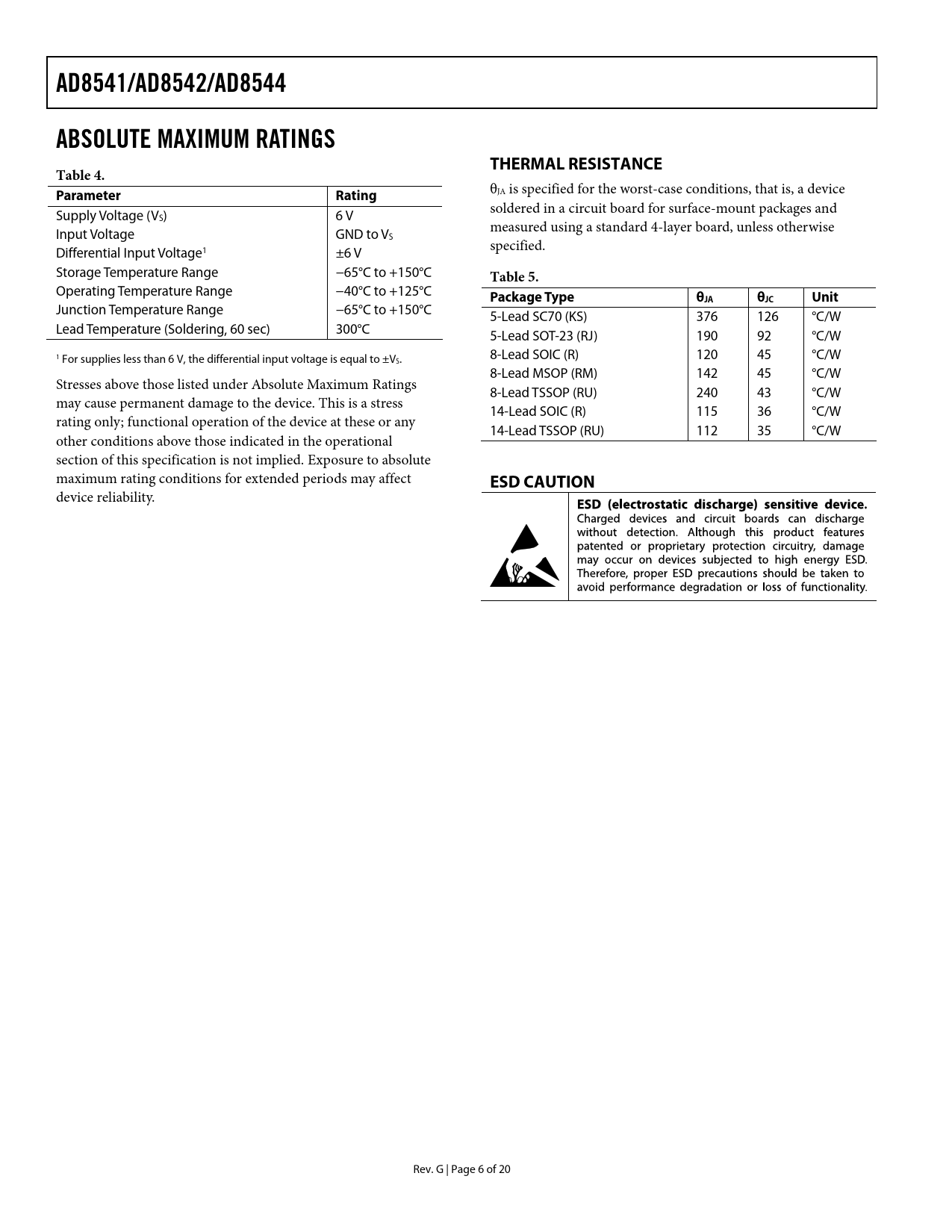 AD8541/AD8542/AD8544 ABSOLUTE MAXIMUM RATINGS THERMAL RESISTANCE Table 4.