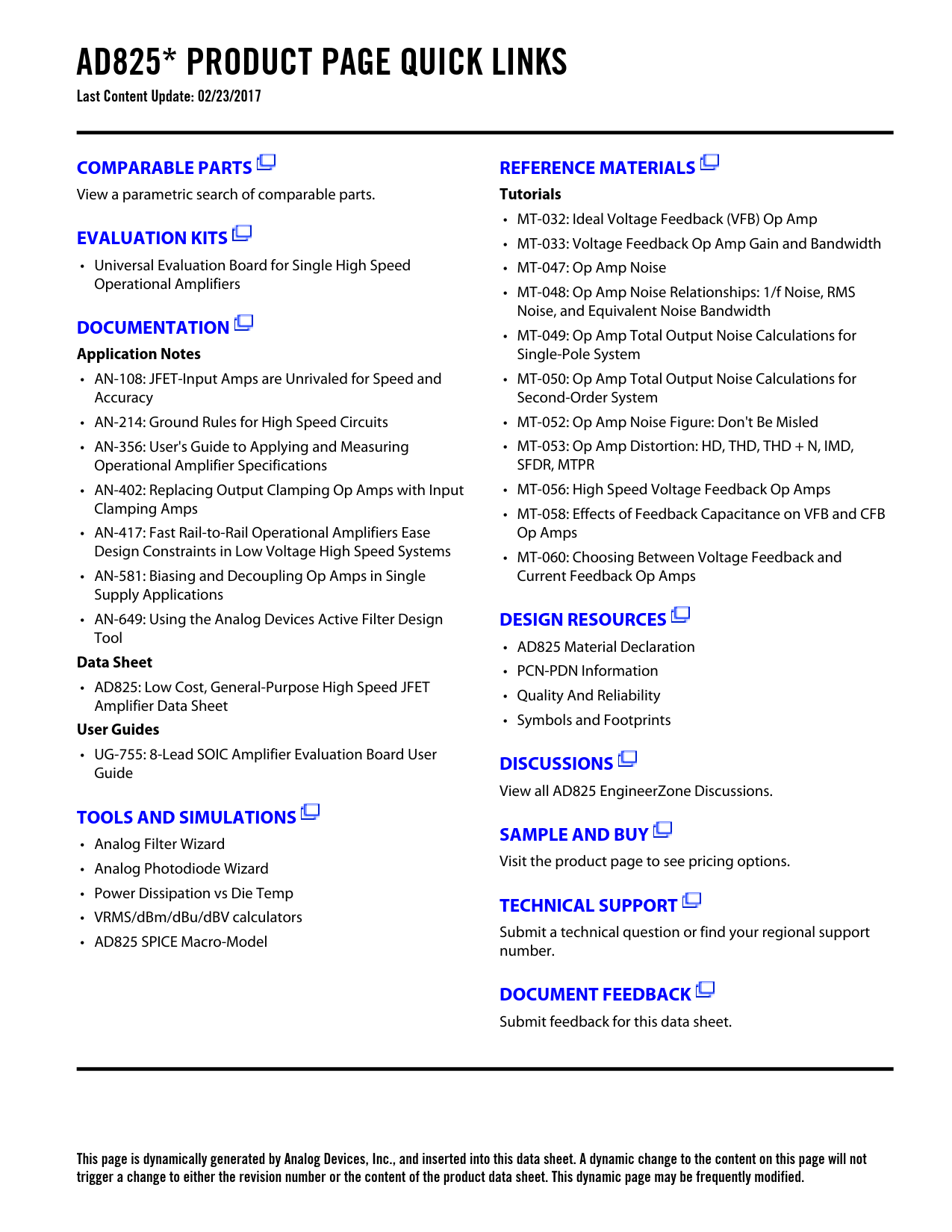 AD825* PRODUCT PAGE QUICK LINKS Last Content Update: 02/23/2017COMPARABLE PARTSREFERENCE MATERIALS View a parametric search of comparable parts. Tutorials • MT-032: Ideal Voltage Feedback (VFB) Op Amp EVALUATION KITS • MT-033: Voltage Feedback Op Amp Gain and Bandwidth • Universal Evaluation Board for Single High Speed • MT-047: Op Amp Noise Operational Amplifiers • MT-048: Op Amp Noise Relationships: 1/f Noise, RMS Noise, and Equivalent Noise Bandwidth DOCUMENTATION • MT-049: Op Amp Total Output Noise Calculations for Application Notes Single-Pole System • AN-108: JFET-Input Amps are Unrivaled for Speed and • MT-050: Op Amp Total Output Noise Calculations for Accuracy Second-Order System • AN-214: Ground Rules for High Speed Circuits • MT-052: Op Amp Noise Figure: Don't Be Misled • AN-356: User's Guide to Applying and Measuring • MT-053: Op Amp Distortion: HD, THD, THD + N, IMD, Operational Amplifier Specifications SFDR, MTPR • AN-402: Replacing Output Clamping Op Amps with Input • MT-056: High Speed Voltage Feedback Op Amps Clamping Amps • MT-058: Effects of Feedback Capacitance on VFB and CFB • AN-417: Fast Rail-to-Rail Operational Amplifiers Ease Op Amps Design Constraints in Low Voltage High Speed Systems • MT-060: Choosing Between Voltage Feedback and • AN-581: Biasing and Decoupling Op Amps in Single Current Feedback Op Amps Supply Applications • AN-649: Using the Analog Devices Active Filter Design DESIGN RESOURCES Tool • AD825 Material Declaration Data Sheet • PCN-PDN Information • AD825: Low Cost, General-Purpose High Speed JFET • Quality And Reliability Amplifier Data Sheet • Symbols and Footprints User Guides • UG-755: 8-Lead SOIC Amplifier Evaluation Board User DISCUSSIONS Guide View all AD825 EngineerZone Discussions. TOOLS AND SIMULATIONSSAMPLE AND BUY • Analog Filter Wizard • Analog Photodiode Wizard Visit the product page to see pricing options. • Power Dissipation vs Die Temp TECHNICAL SUPPORT • VRMS/dBm/dBu/dBV calculators Submit a technical question or find your regional support • AD825 SPICE Macro-Model number. DOCUMENT FEEDBACK Submit feedback for this data sheet. This page is dynamically generated by Analog Devices, Inc., and inserted into this data sheet. A dynamic change to the content on this page will not trigger a change to either the revision number or the content of the product data sheet. This dynamic page may be frequently modified. Document Outline Features Applications Connection Diagrams General Description Table of Contents Revision History Specifications Absolute Maximum Ratings Pin Configurations ESD Caution Typical Performance Characteristics Driving Capacitive Loads Theory of Operation Input Consideration Grounding and Bypassing Second-Order Low-Pass Filter Outline Dimensions Ordering Guide