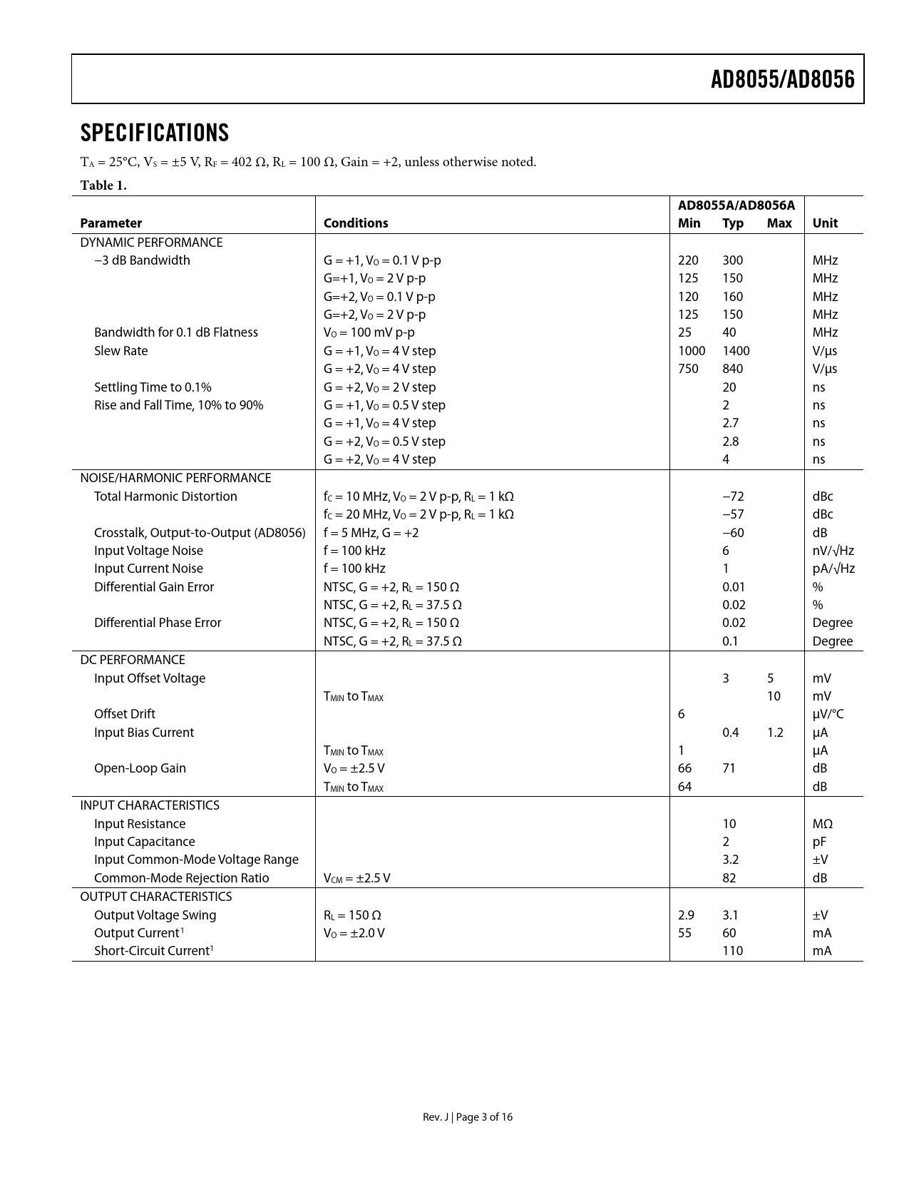 AD8055/AD8056. SPECIFICATIONS. Table 1. AD8055A/AD8056A. Parameter. Conditions. Min. Typ. Max. Unit