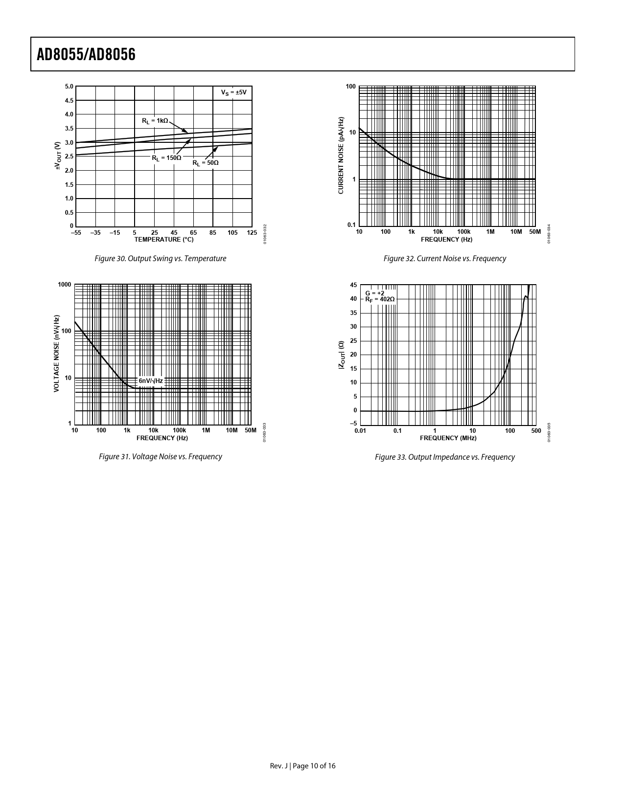 06 0 01 Figure 30. Output Swing vs. Temperature Figure 32. Current Noise vs. Frequency
