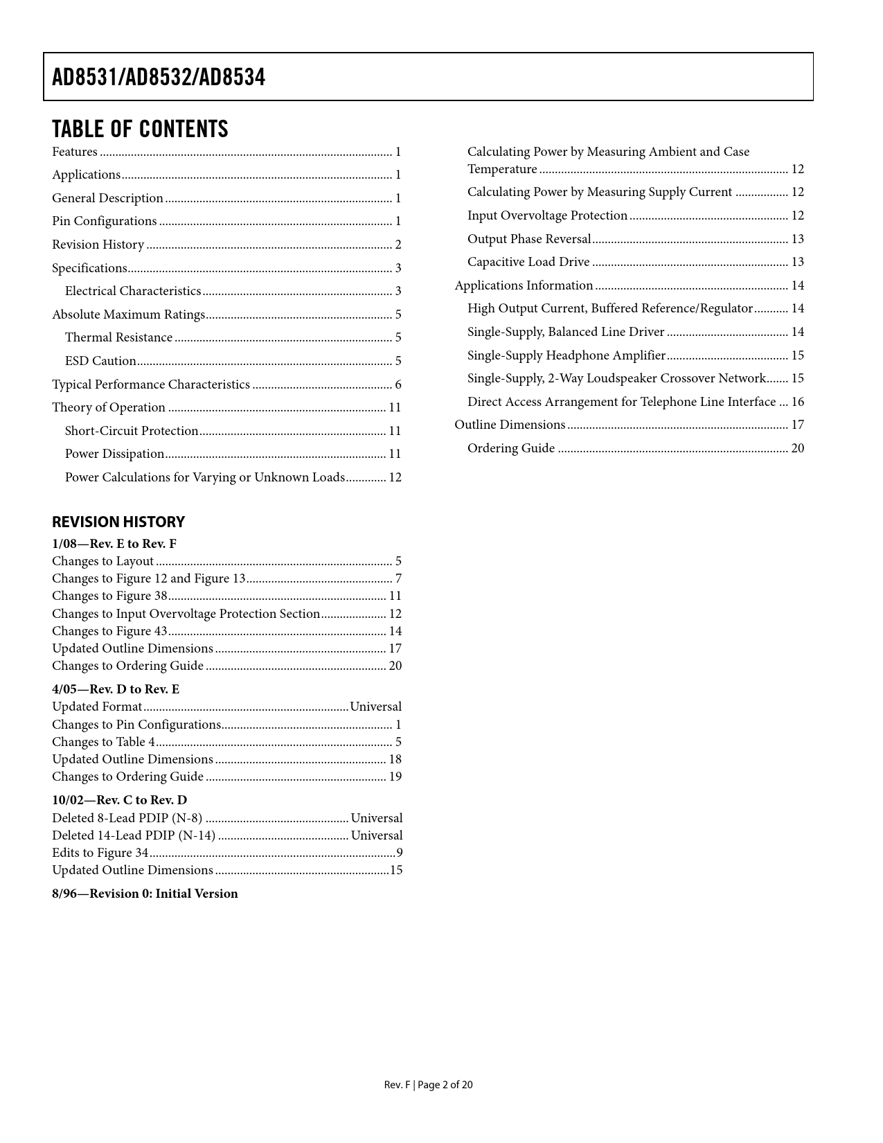 页数 / 页20 / 2 — AD8531/AD8532/AD8534. TABLE OF CONTENTS. REVISION HISTORY. 1/08—Rev. E to …
