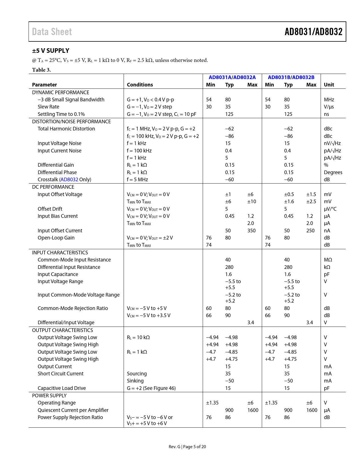 Data Sheet. AD8031/AD8032. ±5 V SUPPLY. Table 3. AD8031A/. AD8032A. AD8031B/. AD8032B. Parameter. Conditions. Min. Typ. Max. Unit