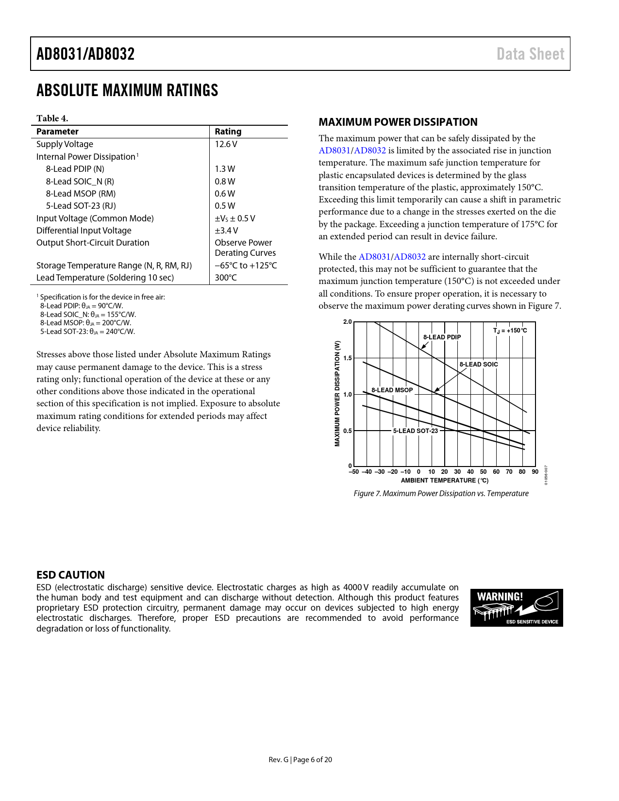 AD8031/AD8032. Data Sheet. ABSOLUTE MAXIMUM RATINGS. Table 4. MAXIMUM POWER DISSIPATION. Parameter. Rating. 2.0. TJ = +150°C. 8-LEAD PDIP