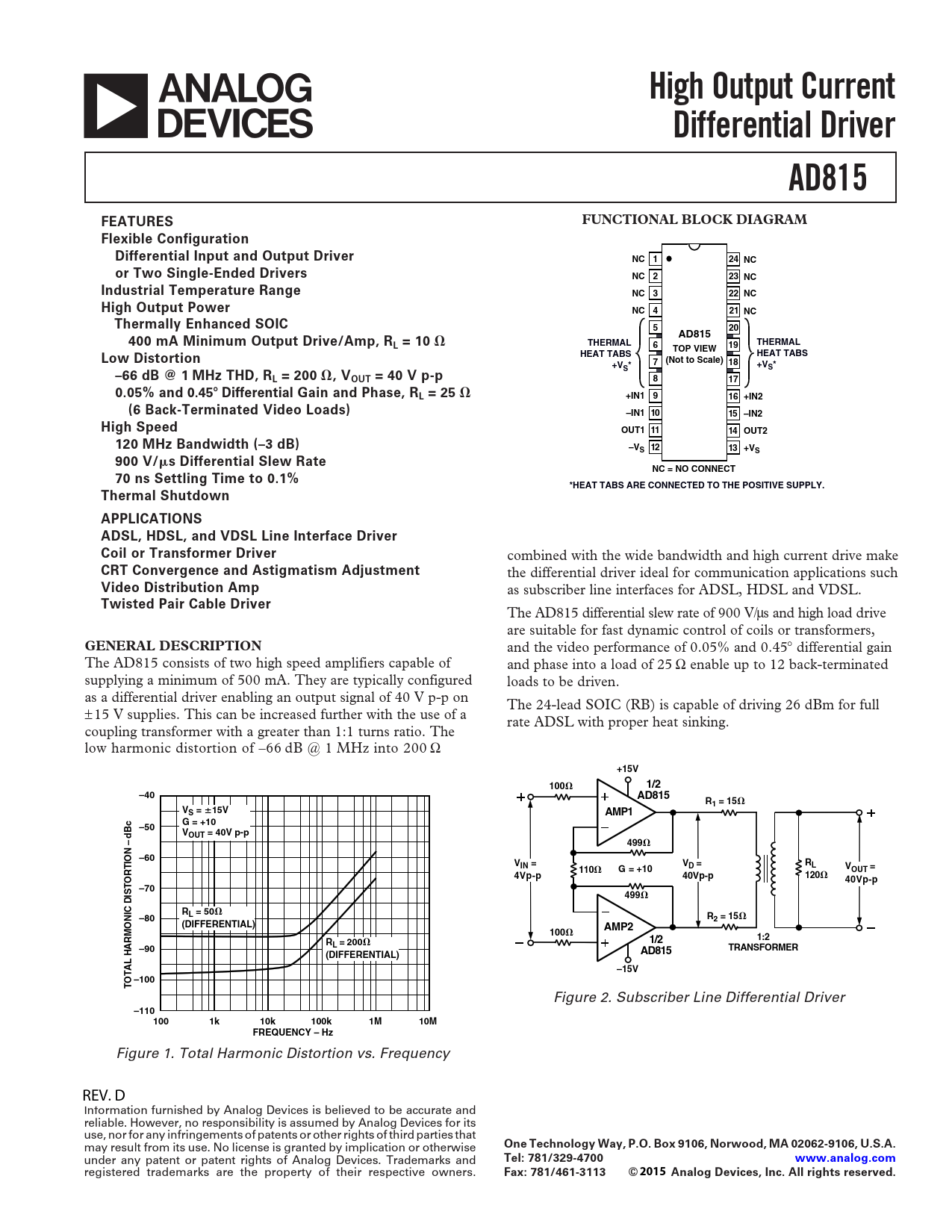 and the video performance of 0.05% and 0.45° differential gain The AD815 consists of two high speed amplifiers capable of and phase into a load of 25 Ω enable up to 12 back-terminated supplying a minimum of 500 mA. They are typically configured loads to be driven. as a differential driver enabling an output signal of 40 V p-p on ± The 24-lead SOIC (RB) is capable of driving 26 dBm for full 15 V supplies. This can be increased further with the use of a rate ADSL with proper heat sinking. coupling transformer with a greater than 1:1 turns ratio. The low harmonic distortion of –66 dB @ 1 MHz into 200 Ω