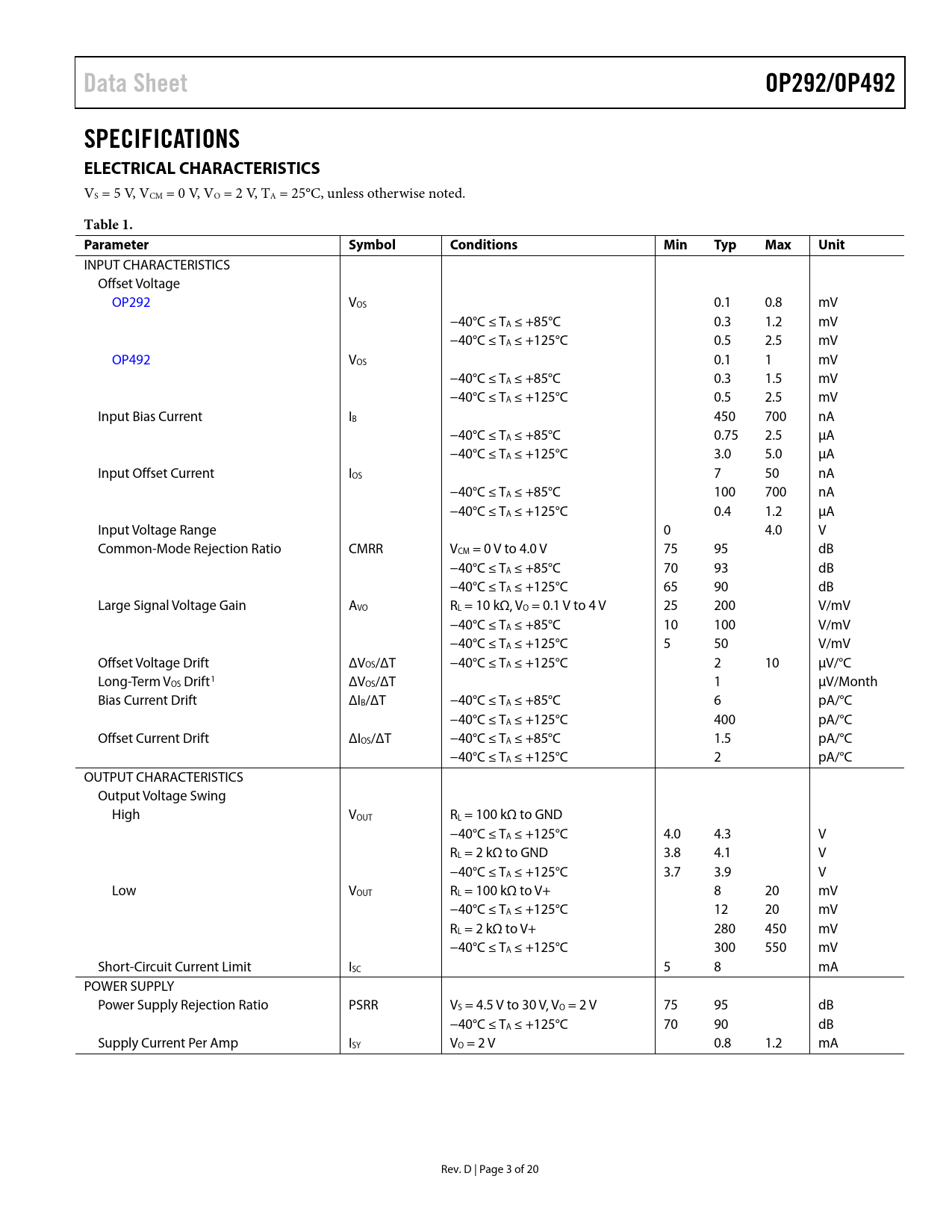 link to page 4 Data SheetOP292/OP492SPECIFICATIONS ELECTRICAL CHARACTERISTICS VS = 5 V, VCM = 0 V, VO = 2 V, TA = 25°C, unless otherwise noted. Table 1. ParameterSymbolConditionsMinTypMaxUnit INPUT CHARACTERISTICS Offset Voltage OP292 VOS 0.1 0.8 mV −40°C ≤ TA ≤ +85°C 0.3 1.2 mV −40°C ≤ TA ≤ +125°C 0.5 2.5 mV OP492 VOS 0.1 1 mV −40°C ≤ TA ≤ +85°C 0.3 1.5 mV −40°C ≤ TA ≤ +125°C 0.5 2.5 mV Input Bias Current IB 450 700 nA −40°C ≤ TA ≤ +85°C 0.75 2.5 µA −40°C ≤ TA ≤ +125°C 3.0 5.0 µA Input Offset Current IOS 7 50 nA −40°C ≤ TA ≤ +85°C 100 700 nA −40°C ≤ TA ≤ +125°C 0.4 1.2 µA Input Voltage Range 0 4.0 V Common-Mode Rejection Ratio CMRR VCM = 0 V to 4.0 V 75 95 dB −40°C ≤ TA ≤ +85°C 70 93 dB −40°C ≤ TA ≤ +125°C 65 90 dB Large Signal Voltage Gain AVO RL = 10 kΩ, VO = 0.1 V to 4 V 25 200 V/mV −40°C ≤ TA ≤ +85°C 10 100 V/mV −40°C ≤ TA ≤ +125°C 5 50 V/mV Offset Voltage Drift ΔVOS/ΔT −40°C ≤ TA ≤ +125°C 2 10 µV/°C Long-Term VOS Drift1 ΔVOS/ΔT 1 µV/Month Bias Current Drift ΔIB/ΔT −40°C ≤ TA ≤ +85°C 6 pA/°C −40°C ≤ TA ≤ +125°C 400 pA/°C Offset Current Drift ΔIOS/ΔT −40°C ≤ TA ≤ +85°C 1.5 pA/°C −40°C ≤ TA ≤ +125°C 2 pA/°C OUTPUT CHARACTERISTICS Output Voltage Swing High VOUT RL = 100 kΩ to GND −40°C ≤ TA ≤ +125°C 4.0 4.3 V RL = 2 kΩ to GND 3.8 4.1 V −40°C ≤ TA ≤ +125°C 3.7 3.9 V Low VOUT RL = 100 kΩ to V+ 8 20 mV −40°C ≤ TA ≤ +125°C 12 20 mV RL = 2 kΩ to V+ 280 450 mV −40°C ≤ TA ≤ +125°C 300 550 mV Short-Circuit Current Limit ISC 5 8 mA POWER SUPPLY Power Supply Rejection Ratio PSRR VS = 4.5 V to 30 V, VO = 2 V 75 95 dB −40°C ≤ TA ≤ +125°C 70 90 dB Supply Current Per Amp ISY VO = 2 V 0.8 1.2 mA Rev. D | Page 3 of 20 Document Outline FEATURES APPLICATIONS PIN CONFIGURATIONS GENERAL DESCRIPTION TABLE OF CONTENTS REVISION HISTORY SPECIFICATIONS ELECTRICAL CHARACTERISTICS ABSOLUTE MAXIMUM RATINGS THERMAL RESISTANCE ESD CAUTION TYPICAL PERFORMANCE CHARACTERISTICS APPLICATIONS INFORMATION PHASE REVERSAL POWER SUPPLY CONSIDERATIONS TYPICAL APPLICATIONS DIRECT ACCESS ARRANGEMENT FOR TELEPHONE LINE INTERFACE SINGLE-SUPPLY INSTRUMENTATION AMPLIFIER DAC OUTPUT AMPLIFIER 50 Hz/60 Hz SINGLE-SUPPLY NOTCH FILTER FOUR-POLE BESSEL LOW-PASS FILTER LOW COST, LINEARIZED THERMISTOR AMPLIFIER SINGLE-SUPPLY ULTRASONIC CLAMPING/LIMITING RECEIVER AMPLIFIER PRECISION SINGLE-SUPPLY VOLTAGE COMPARATOR PROGRAMMABLE PRECISION WINDOW COMPARATOR OUTLINE DIMENSIONS ORDERING GUIDE