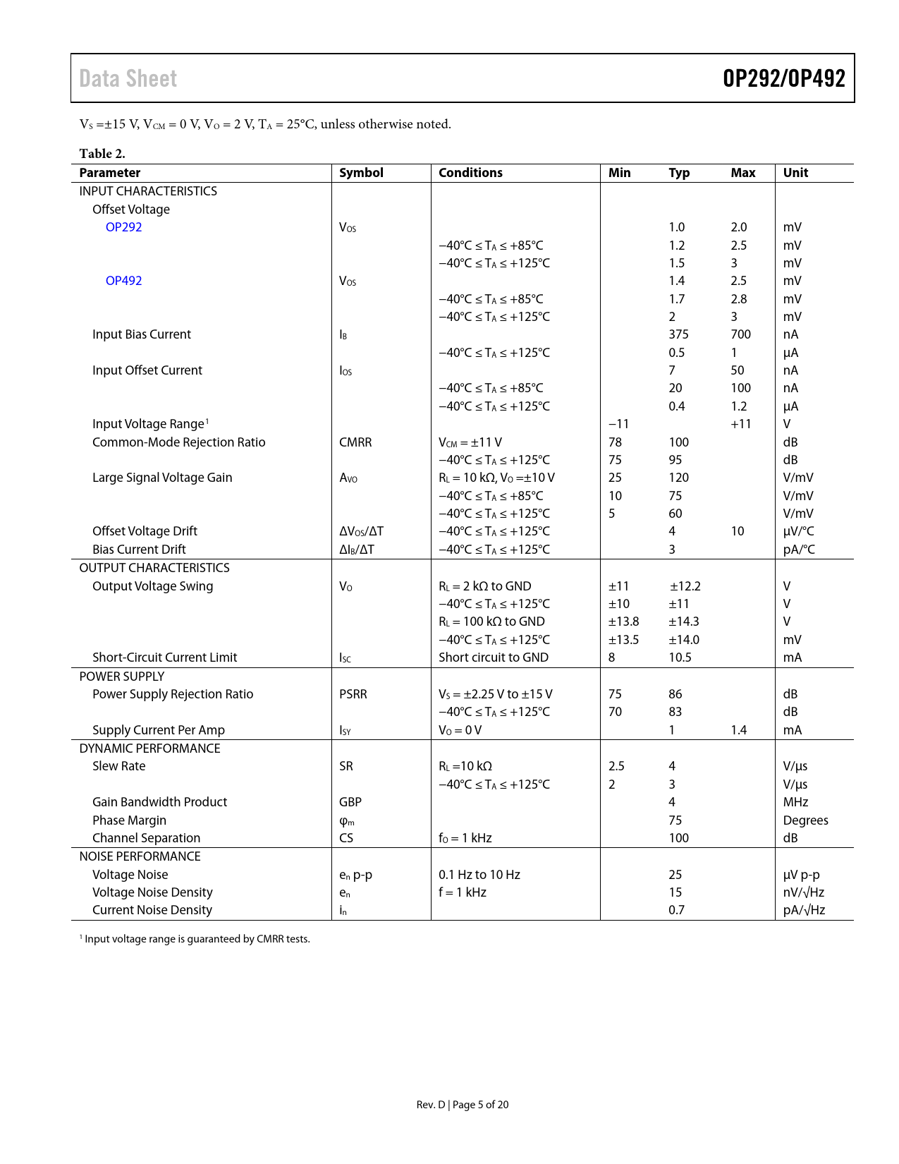 Data Sheet OP292/OP492 Table 2 Parameter Symbol Conditions Min Typ Max Unit