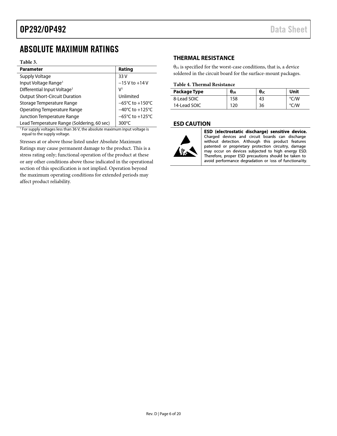 OP292/OP492 Data Sheet ABSOLUTE MAXIMUM RATINGS THERMAL RESISTANCE Table 3 Parameter Rating Table 4 Thermal Resistance