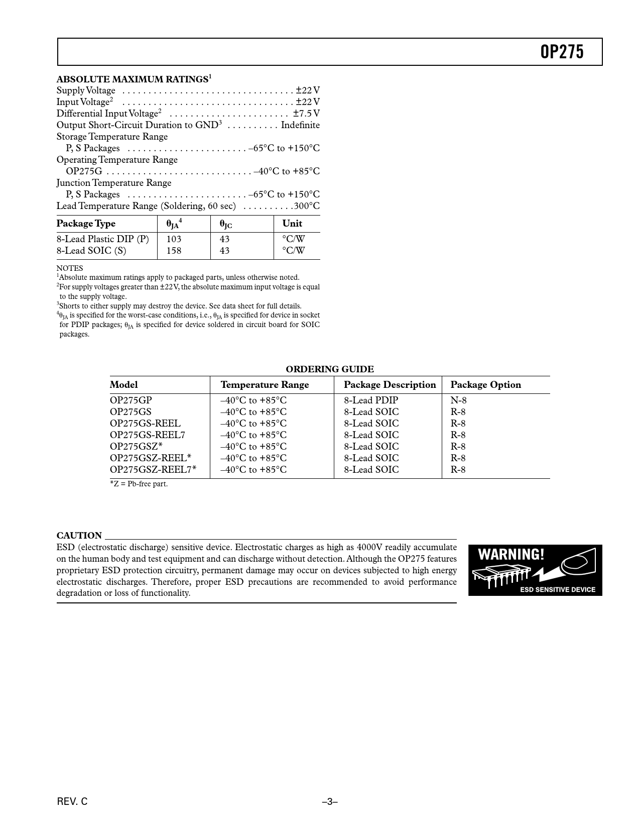 OP275–SPECIFICATIONS. OP275. ABSOLUTE MAXIMUM RATINGS1. Package Type. JC Unit. ORDERING GUIDE. Model Temperature Range