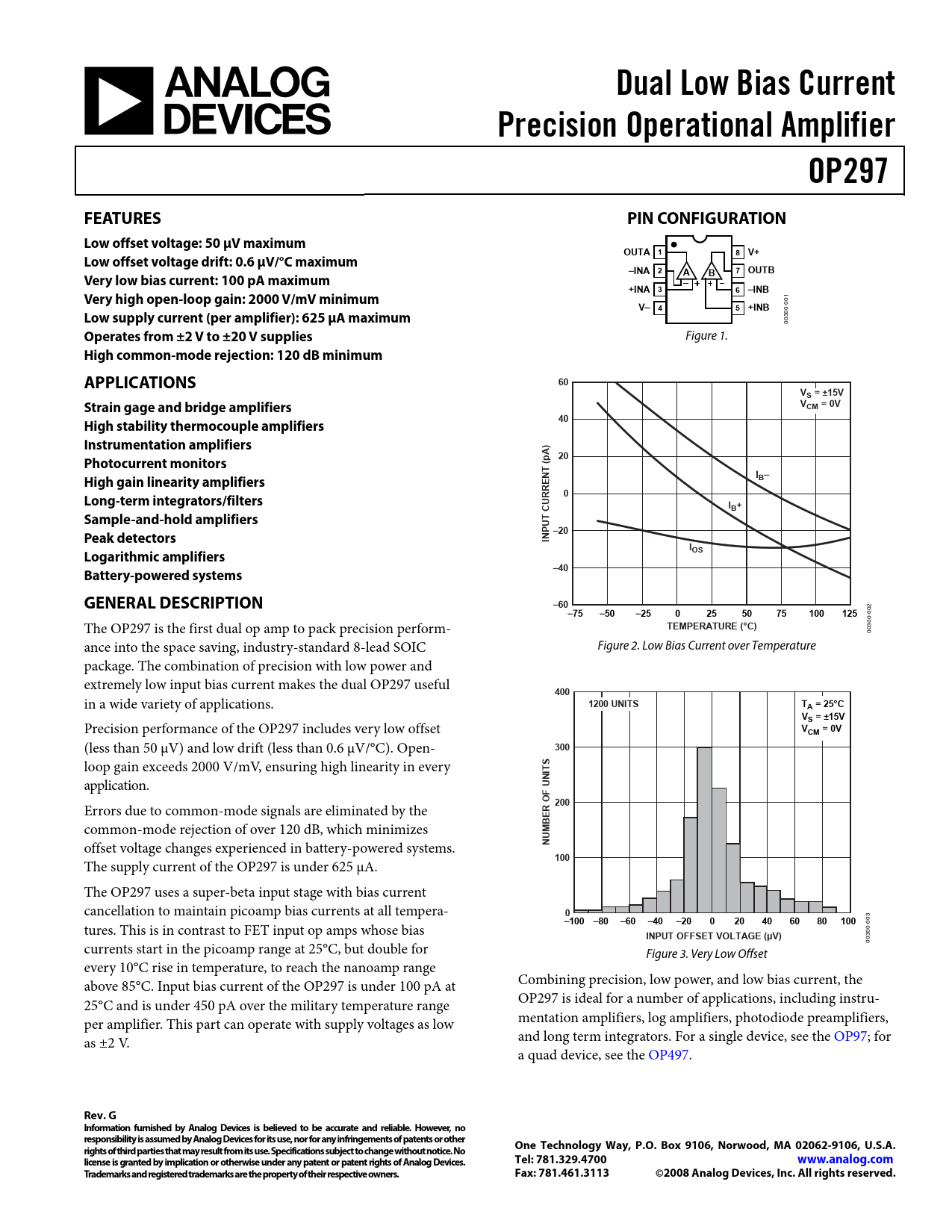Dual Low Bias Current. Precision Operational Amplifier. OP297. FEATURES. PIN CONFIGURATION. Low offset voltage: 50 μV maximum