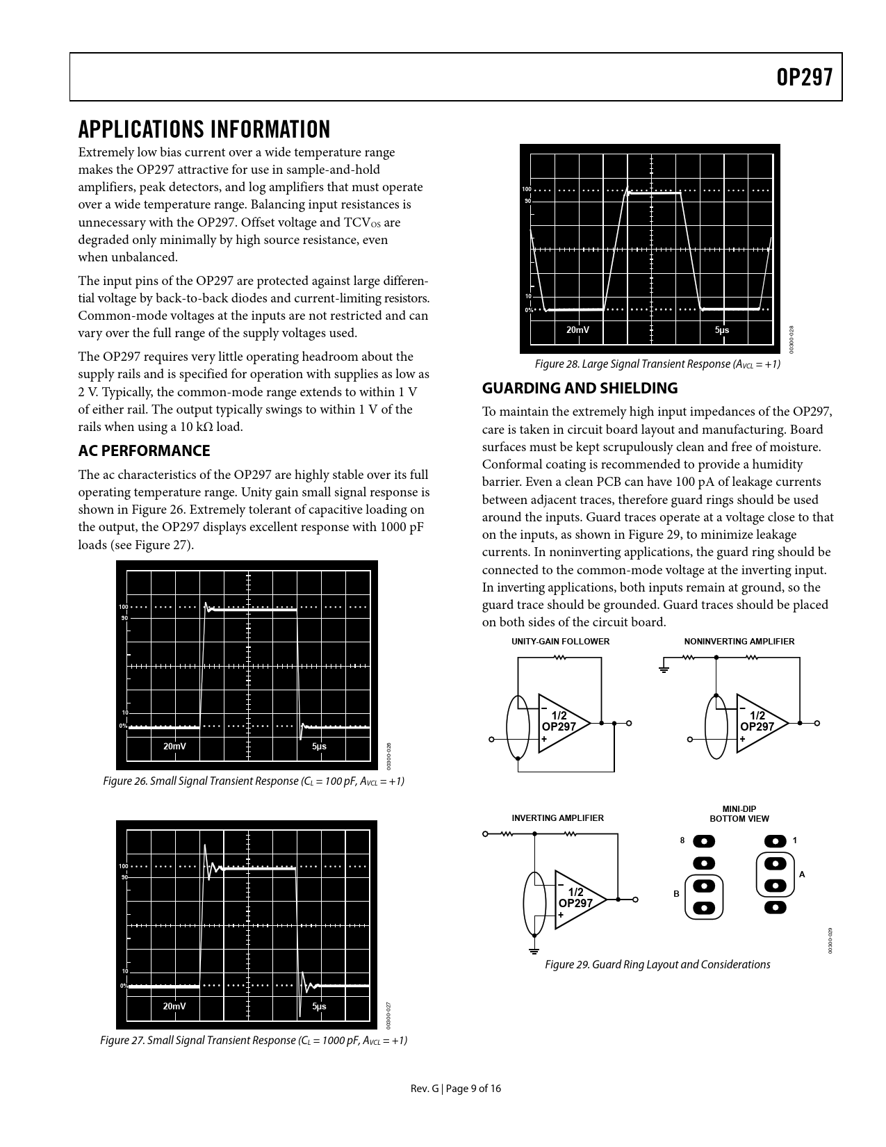 OP297. APPLICATIONS INFORMATION. 100. 20mV. 5µs. GUARDING AND SHIELDING. AC PERFORMANCE. UNITY-GAIN FOLLOWER. NONINVERTING AMPLIFIER. 1/2