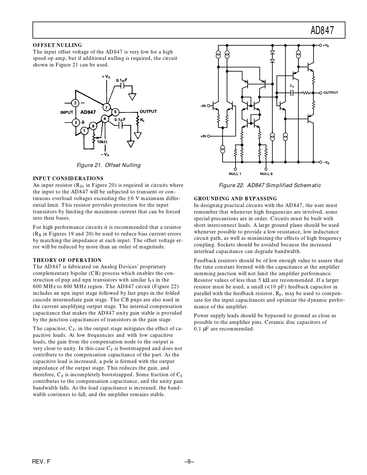 AD847. OFFSET NULLING. +VS. C F. OUTPUT. –IN. +IN. NULL 1. NULL 8. INPUT CONSIDERATIONS. GROUNDING AND BYPASSING. THEORY OF OPERATION