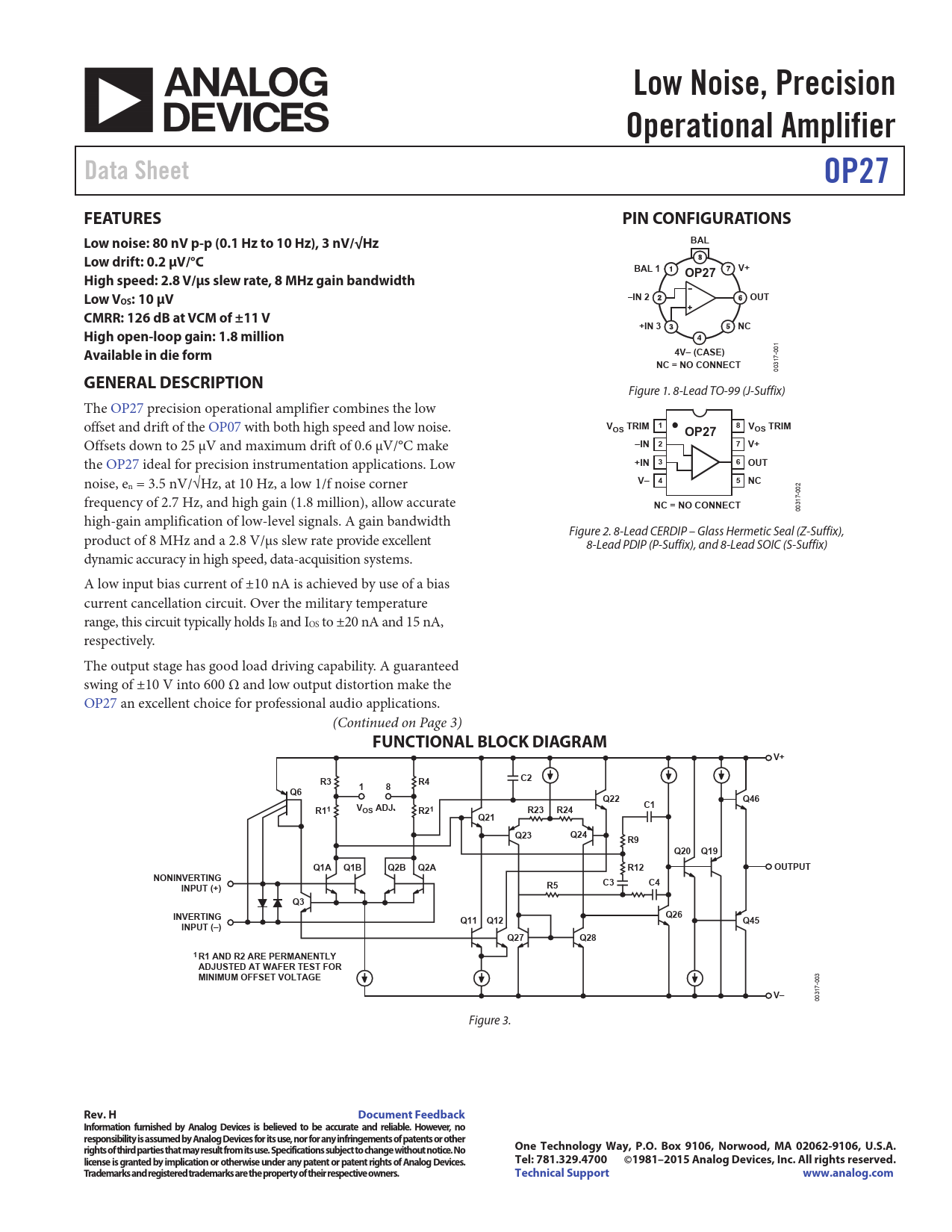 Figure 1. 8-Lead TO-99 (J-Suffix) The OP27 precision operational amplifier combines the low offset and drift of the OP07 with both high speed and low noise.