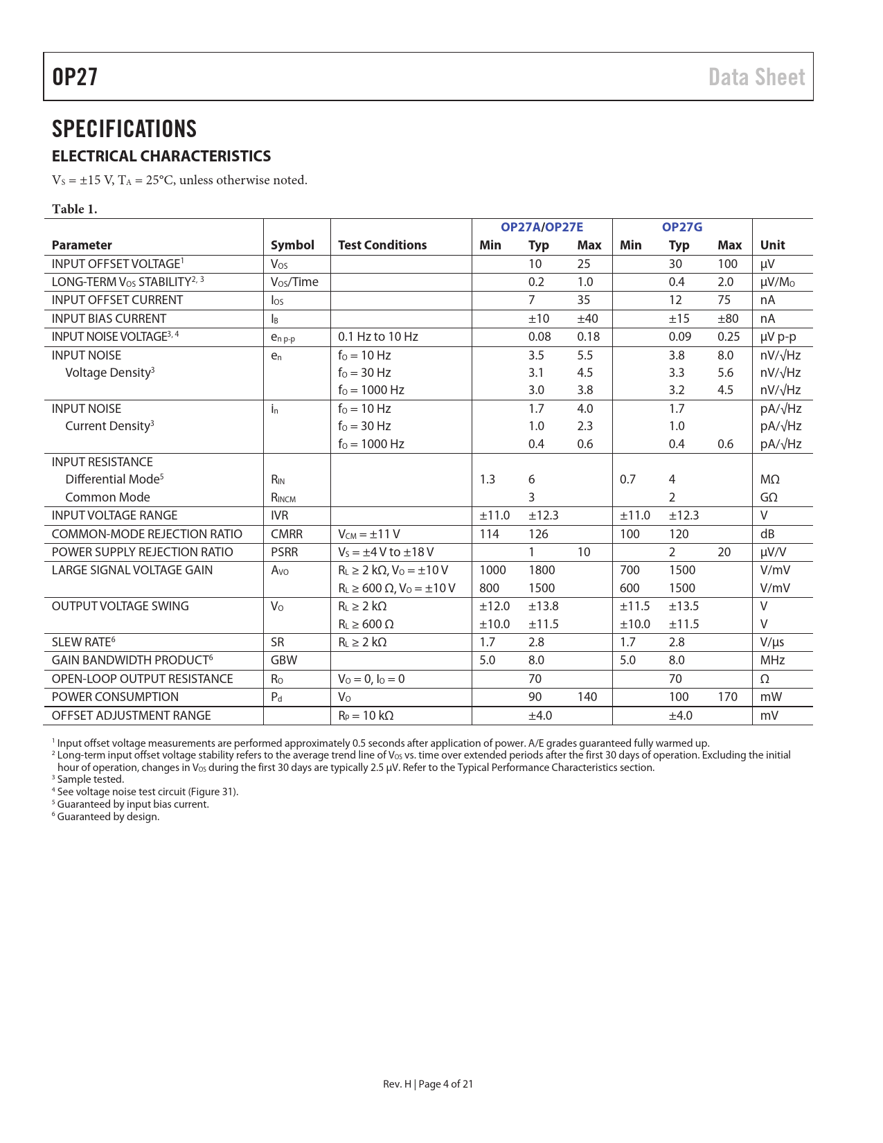 OP27 Data Sheet SPECIFICATIONS ELECTRICAL CHARACTERISTICS VS = ±15 V, TA = 25°C, unless otherwise noted. Table 1.OP27A/OP27EOP27GParameterSymbolTest ConditionsMinTypMaxMinTypMaxUnit INPUT OFFSET VOLTAGE1 VOS 10 25 30 100 µV LONG-TERM VOS STABILITY2, 3 VOS/Time 0.2 1.0 0.4 2.0 µV/MO INPUT OFFSET CURRENT IOS 7 35 12 75 nA INPUT BIAS CURRENT IB ±10 ±40 ±15 ±80 nA INPUT NOISE VOLTAGE3, 4 en p-p 0.1 Hz to 10 Hz 0.08 0.18 0.09 0.25 µV p-p INPUT NOISE en fO = 10 Hz 3.5 5.5 3.8 8.0 nV/√Hz Voltage Density3 fO = 30 Hz 3.1 4.5 3.3 5.6 nV/√Hz fO = 1000 Hz 3.0 3.8 3.2 4.5 nV/√Hz INPUT NOISE in fO = 10 Hz 1.7 4.0 1.7 pA/√Hz Current Density3 fO = 30 Hz 1.0 2.3 1.0 pA/√Hz fO = 1000 Hz 0.4 0.6 0.4 0.6 pA/√Hz INPUT RESISTANCE Differential Mode5 RIN 1.3 6 0.7 4 MΩ Common Mode RINCM 3 2 GΩ INPUT VOLTAGE RANGE IVR ±11.0 ±12.3 ±11.0 ±12.3 V COMMON-MODE REJECTION RATIO CMRR VCM = ±11 V 114 126 100 120 dB POWER SUPPLY REJECTION RATIO PSRR VS = ±4 V to ±18 V 1 10 2 20 µV/V LARGE SIGNAL VOLTAGE GAIN AVO RL ≥ 2 kΩ, VO = ±10 V 1000 1800 700 1500 V/mV RL ≥ 600 Ω, VO = ±10 V 800 1500 600 1500 V/mV OUTPUT VOLTAGE SWING VO RL ≥ 2 kΩ ±12.0 ±13.8 ±11.5 ±13.5 V RL ≥ 600 Ω ±10.0 ±11.5 ±10.0 ±11.5 V SLEW RATE6 SR RL ≥ 2 kΩ 1.7 2.8 1.7 2.8 V/µs GAIN BANDWIDTH PRODUCT6 GBW 5.0 8.0 5.0 8.0 MHz OPEN-LOOP OUTPUT RESISTANCE RO VO = 0, IO = 0 70 70 Ω POWER CONSUMPTION Pd VO 90 140 100 170 mW OFFSET ADJUSTMENT RANGE RP = 10 kΩ ±4.0 ±4.0 mV 1 Input offset voltage measurements are performed approximately 0.5 seconds after application of power. A/E grades guaranteed fully warmed up. 2 Long-term input offset voltage stability refers to the average trend line of VOS vs. time over extended periods after the first 30 days of operation. Excluding the initial hour of operation, changes in VOS during the first 30 days are typically 2.5 µV. Refer to the Typical Performance Characteristics section. 3 Sample tested. 4 See voltage noise test circuit (Figure 31). 5 Guaranteed by input bias current. 6 Guaranteed by design. Rev. H | Page 4 of 21