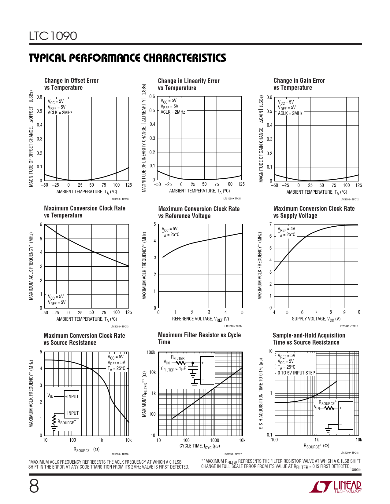 0.6  (LSBs) 0.6 0.6 V V  (LSBs) CC = 5V CC = 5V VCC = 5V V V REF = 5V REF = 5V  (LSBs) VREF = 5V 0.5 0.5 ACLK = 2MHz ACLK = 2MHz 0.5 ACLK = 2MHz OFFSET LINEARITY GAIN ∆ ∆ 0.4 0.4 ∆ 0.4 0.3 0.3 0.3 0.2 0.2 0.2 0.1 0.1 0.1 0 0 MAGNITUDE OF GAIN CHANGE, 0 MAGNITUDE OF OFFSET CHANGE, –50 –25 0 25 50 75 100 125 –50 –25 0 25 50 75 100 125 –50 –25 0 25 50 75 100 125 AMBIENT TEMPERATURE, T MAGNITUDE OF LINEARITY CHANGE, AMBIENT TEMPERATURE, T A (°C) A (°C) AMBIENT TEMPERATURE, TA (°C) LTC1090 • TPC10 LTC1090 • TPC11 LTC1090 • TPC12