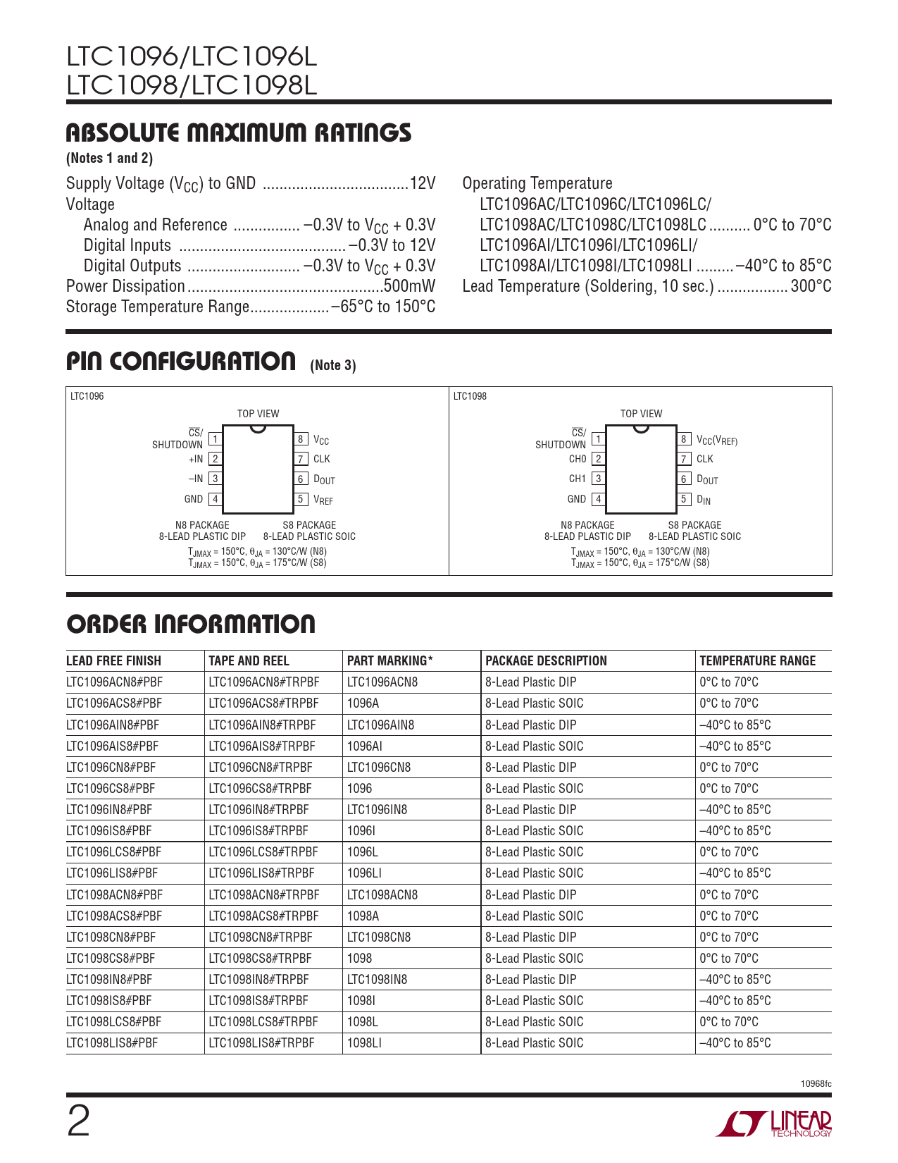 LTC1096ACN8#PBF LTC1096ACN8#TRPBF LTC1096ACN8 8-Lead Plastic DIP 0°C to 70°C LTC1096ACS8#PBF LTC1096ACS8#TRPBF 1096A 8-Lead Plastic SOIC 0°C to 70°C LTC1096AIN8#PBF LTC1096AIN8#TRPBF LTC1096AIN8 8-Lead Plastic DIP –40°C to 85°C LTC1096AIS8#PBF LTC1096AIS8#TRPBF 1096AI 8-Lead Plastic SOIC –40°C to 85°C LTC1096CN8#PBF LTC1096CN8#TRPBF LTC1096CN8 8-Lead Plastic DIP 0°C to 70°C LTC1096CS8#PBF LTC1096CS8#TRPBF 1096 8-Lead Plastic SOIC 0°C to 70°C LTC1096IN8#PBF LTC1096IN8#TRPBF LTC1096IN8 8-Lead Plastic DIP –40°C to 85°C LTC1096IS8#PBF LTC1096IS8#TRPBF 1096I 8-Lead Plastic SOIC –40°C to 85°C LTC1096LCS8#PBF LTC1096LCS8#TRPBF 1096L 8-Lead Plastic SOIC 0°C to 70°C LTC1096LIS8#PBF LTC1096LIS8#TRPBF 1096LI 8-Lead Plastic SOIC –40°C to 85°C LTC1098ACN8#PBF LTC1098ACN8#TRPBF LTC1098ACN8 8-Lead Plastic DIP 0°C to 70°C LTC1098ACS8#PBF LTC1098ACS8#TRPBF 1098A 8-Lead Plastic SOIC 0°C to 70°C LTC1098CN8#PBF LTC1098CN8#TRPBF LTC1098CN8 8-Lead Plastic DIP 0°C to 70°C LTC1098CS8#PBF LTC1098CS8#TRPBF 1098 8-Lead Plastic SOIC 0°C to 70°C LTC1098IN8#PBF LTC1098IN8#TRPBF LTC1098IN8 8-Lead Plastic DIP –40°C to 85°C LTC1098IS8#PBF LTC1098IS8#TRPBF 1098I 8-Lead Plastic SOIC –40°C to 85°C LTC1098LCS8#PBF LTC1098LCS8#TRPBF 1098L 8-Lead Plastic SOIC 0°C to 70°C LTC1098LIS8#PBF LTC1098LIS8#TRPBF 1098LI 8-Lead Plastic SOIC –40°C to 85°C 10968fc 2