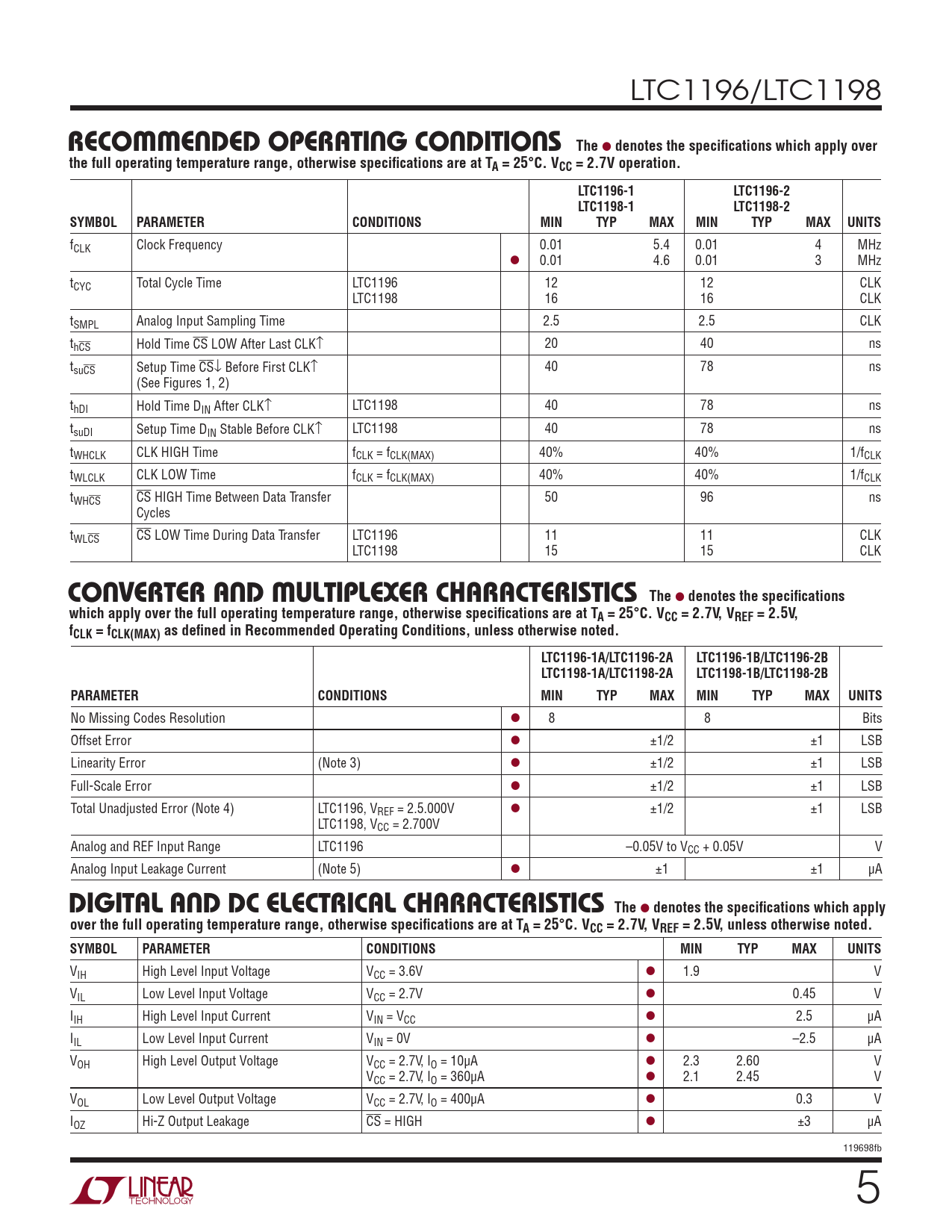 denotes the specifi cations which apply over the full operating temperature range, otherwise specifi cations are at TA = 25°C. VCC = 2.7V, VREF = 2.5V, fCLK = fCLK(MAX) as defi ned in Recommended Operating Conditions, unless otherwise noted. LTC1196-1A/LTC1196-2A LTC1196-1B/LTC1196-2B LTC1198-1A/LTC1198-2A LTC1198-1B/LTC1198-2B PARAMETER CONDITIONS MIN TYP MAX MIN TYP MAX UNITS