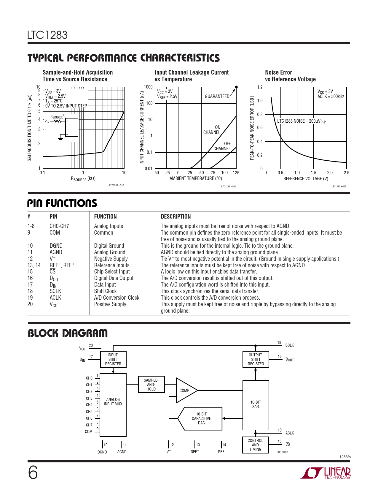 LTC1283 WUTYPICAL PERFOR A CE CHCARA TERISTICSSample-and-Hold AcquisitionInput Channel Leakage CurrentNoise ErrorTime vs Source Resistancevs Temperaturevs Reference Voltage 10 1000 1.2 9 VCC = 3V V V CC = 3V CC = 3V 8 VREF = 2.5V V GUARANTEED ACLK = 500kHz REF = 2.5V μs) 7 T 1.0 A = 25°C 100 6 0V TO 2.5V INPUT STEP 5 + 0.8 RSOURCE 4 10 V + IN LTC1283 NOISE = 200μVP-P ON 0.6 3 CHANNEL – 1 0.4 2 OFF CHANNEL 0.1 0.2 PEAK-TO-PEAK NOISE ERROR (LSB ) S&H ACQUISITION TIME TO 0.1% ( INPUT CHANNEL LEAKAGE CURRENT (nA) 1 0.01 0 0.1 1 10 –50 –25 0 25 50 75 100 125 0 0.5 1.0 1.5 2.0 2.5 R AMBIENT TEMPERATURE (°C) SOURCE (kΩ) REFERENCE VOLTAGE (V) LTC1283 • G13 LTC1283 • G14 LTC1283 • G15 UUUPI FU CTIO S#PINFUNCTIONDESCRIPTION 1-8 CH0-CH7 Analog Inputs The analog inputs must be free of noise with respect to AGND. 9 COM Common The common pin defines the zero reference point for all single-ended inputs. It must be free of noise and is usually tied to the analog ground plane. 10 DGND Digital Ground This is the ground for the internal logic. Tie to the ground plane. 11 AGND Analog Ground AGND should be tied directly to the analog ground plane. 12 V – Negative Supply Tie V – to most negative potential in the circuit. (Ground in single supply applications.) 13, 14 REF –, REF + Reference Inputs The reference inputs must be kept free of noise with respect to AGND. 15 CS Chip Select Input A logic low on this input enables data transfer. 16 DOUT Digital Data Output The A/D conversion result is shifted out of this output. 17 DIN Data Input The A/D configuration word is shifted into this input. 18 SCLK Shift Clock This clock synchronizes the serial data transfer. 19 ACLK A/D Conversion Clock This clock controls the A/D conversion process. 20 VCC Positive Supply This supply must be kept free of noise and ripple by bypassing directly to the analog ground plane. WBLOCK ID AGRA 18 20 SCLK VCC INPUT 17 OUTPUT 16 D SHIFT SHIFT D IN OUT REGISTER REGISTER 1 CH0 SAMPLE- 2 CH1 AND- 3 HOLD CH2 COMP 4 CH3 ANALOG 5 10-BIT INPUT MUX CH4 SAR 6 CH5 10-BIT 7 CH6 CAPACITIVE 8 DAC CH7 9 COM 19 ACLK CONTROL 15 10 11 12 13 14 AND CS TIMING DGND AGND V– REF– REF+ LTC1283 BD 1283fb 6