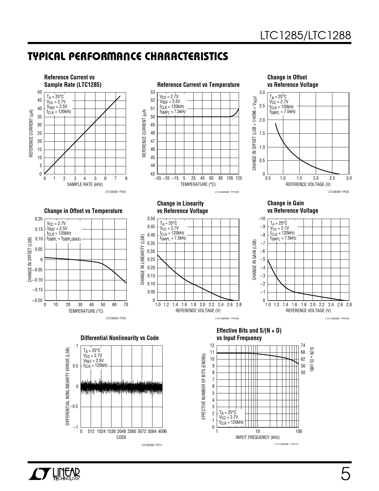 0.20 0.50 –10 VCC = 2.7V T T A = 25°C A = 25°C 0.45 – 9 0.15 VREF = 2.5V V V CC = 2.7V CC = 2.7V fCLK = 120kHz 0.40 fCLK = 120kHz – 8 fCLK = 120kHz 0.10 fSMPL = fSMPL(MAX) f f SMPL = 7.5kHz SMPL = 7.5kHz 0.35 – 7 0.05 0.30 – 6 0 0.25 – 5 0.20 – 4 – 0.05 0.15 – 3 CHANGE IN OFFSET (LSB) – 0.10 CHANGE IN GAIN (LSB) CHANGE IN LINEARITY (LSB) 0.10 – 2 – 0.15 0.05 – 1 – 0.20 0 0 0 10 20 30 40 50 60 70 1.0 1.2 1.4 1.6 1.8 2.0 2.2 2.4 2.6 2.8 1.0 1.2 1.4 1.6 1.8 2.0 2.2 2.4 2.6 2.8 TEMPERATURE (°C) REFERENCE VOLTAGE (V) REFERENCE VOLTAGE (V) LTC1285/88 • TPC07 LTC1285/88 • TPC08 LTC1285/88 • TPC09