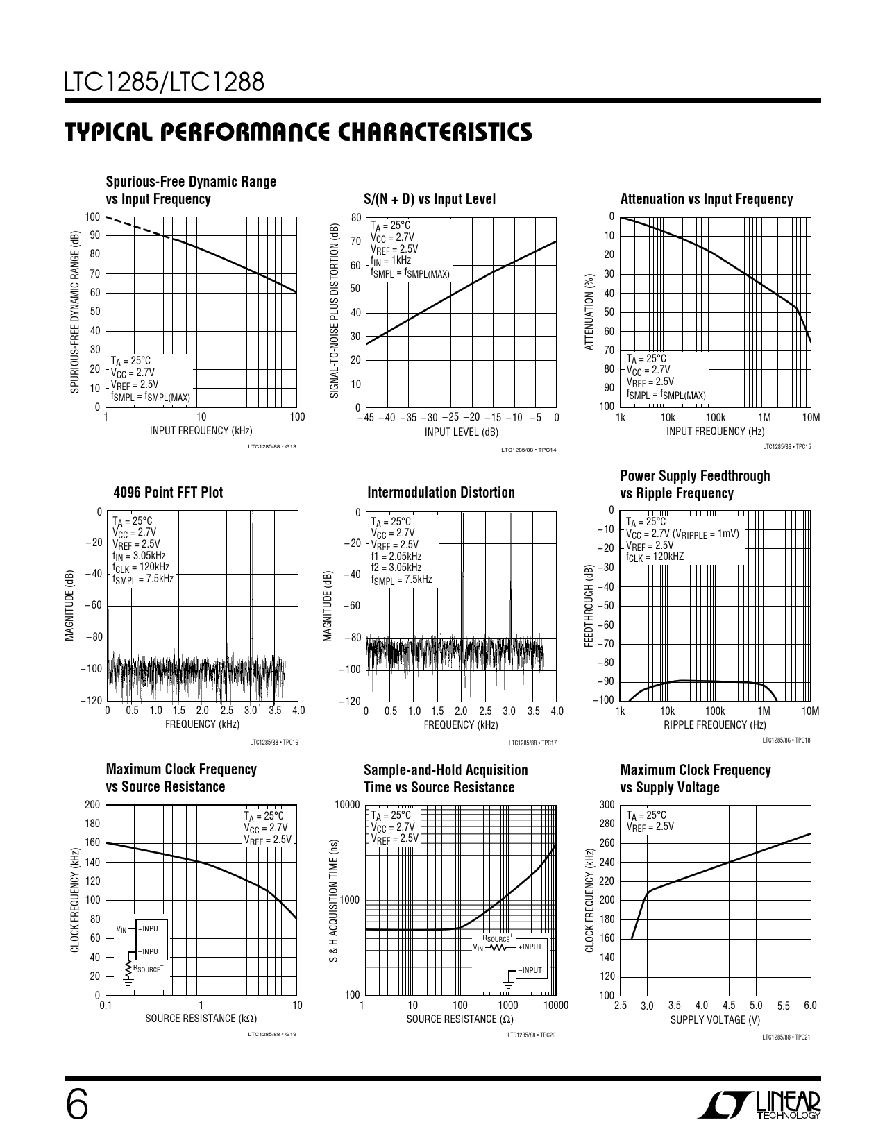 100 80 0 TA = 25°C 90 V 10 70 CC = 2.7V V 80 REF = 2.5V 20 f 60 IN = 1kHz 70 fSMPL = fSMPL(MAX) 30 60 50 40 50 40 50 40 60 30 ATTENUATION (%) 30 70 20 T T A = 25°C A = 25°C 20 80 V V CC = 2.7V CC = 2.7V V V 10 SPURIOUS-FREE DYNAMIC RANGE (dB) 10 REF = 2.5V 90 REF = 2.5V SIGNAL-TO-NOISE PLUS DISTORTION (dB) f f SMPL = fSMPL(MAX) SMPL = fSMPL(MAX) 0 0 100 1 10 100 – 45 – 40 – 35 – 30 – 25 – 20 – 15 – 10 – 5 0 1k 10k 100k 1M 10M INPUT FREQUENCY (kHz) INPUT LEVEL (dB) INPUT FREQUENCY (Hz) LTC1285/88 • G13 LTC1285/86 • TPC15 LTC1285/88 • TPC14