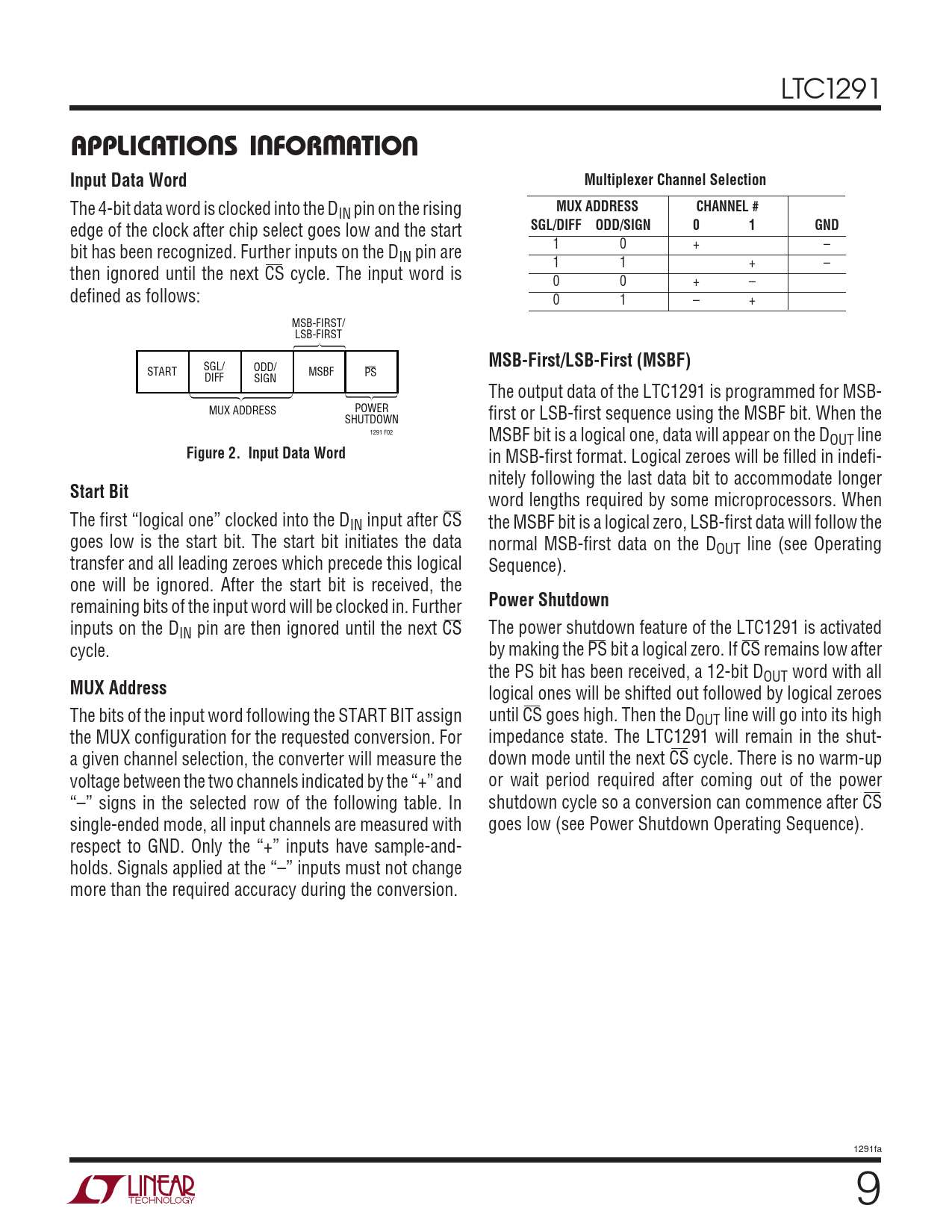 logical ones will be shifted out followed by logical zeroes The bits of the input word following the START BIT assign until CS goes high. Then the DOUT line will go into its high the MUX configuration for the requested conversion. For impedance state. The LTC1291 will remain in the shut- a given channel selection, the converter will measure the down mode until the next CS cycle. There is no warm-up voltage between the two channels indicated by the “+” and or wait period required after coming out of the power “–” signs in the selected row of the following table. In shutdown cycle so a conversion can commence after CS single-ended mode, all input channels are measured with goes low (see Power Shutdown Operating Sequence). respect to GND. Only the “+” inputs have sample-and- holds. Signals applied at the “–” inputs must not change more than the required accuracy during the conversion. 1291fa 9