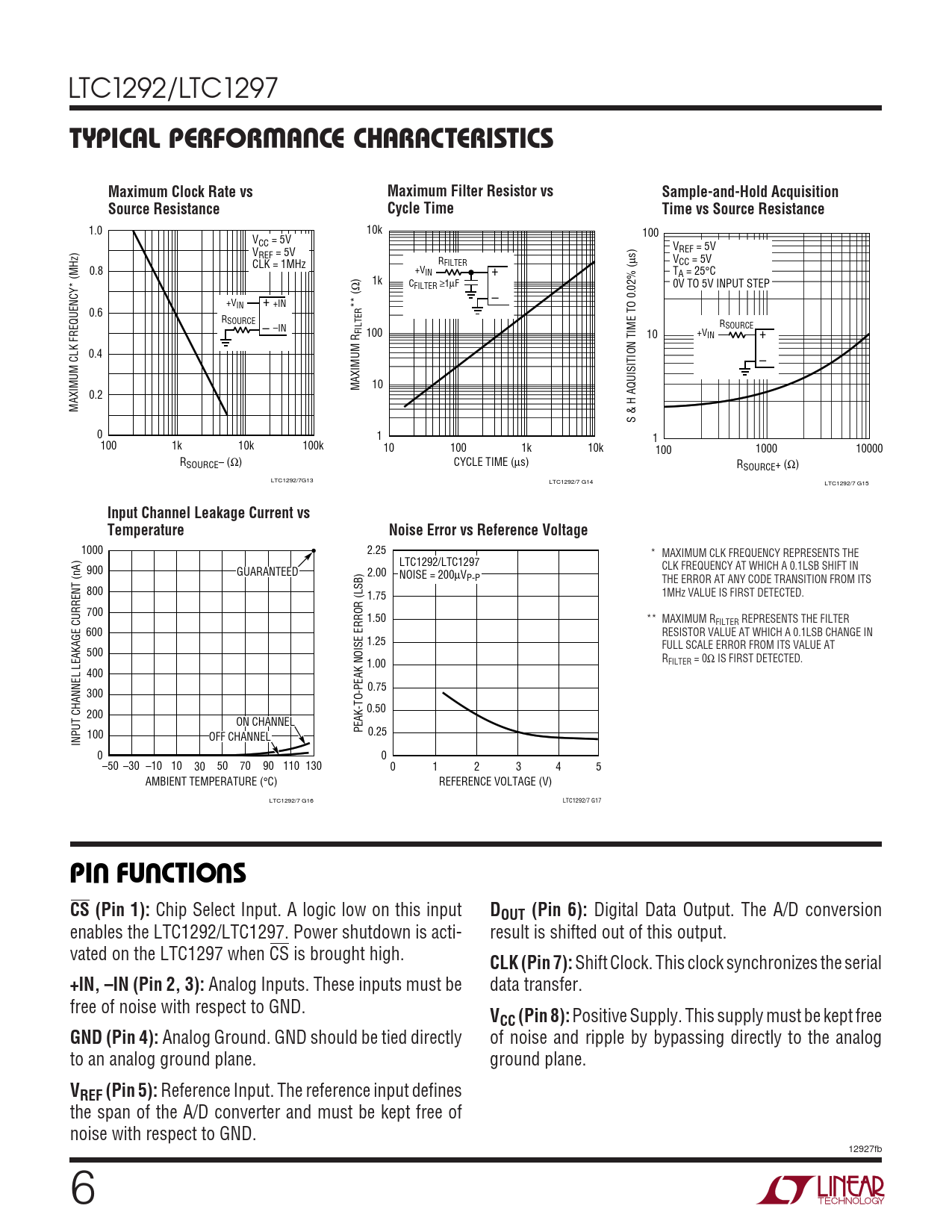 1000 2.25 * MAXIMUM CLK FREQUENCY REPRESENTS THE LTC1292/LTC1297 CLK FREQUENCY AT WHICH A 0.1LSB SHIFT IN 900 GUARANTEED 2.00 NOISE = 200µVP-P THE ERROR AT ANY CODE TRANSITION FROM ITS 800 1MHz VALUE IS FIRST DETECTED. 1.75 700 1.50 ** MAXIMUM RFILTER REPRESENTS THE FILTER 600 RESISTOR VALUE AT WHICH A 0.1LSB CHANGE IN 1.25 FULL SCALE ERROR FROM ITS VALUE AT 500 RFILTER = 0Ω IS FIRST DETECTED. 1.00 400 0.75 300 0.50 200 ON CHANNEL PEAK-TO-PEAK NOISE ERROR (LSB) 100 0.25 INPUT CHANNEL LEAKAGE CURRENT (nA) OFF CHANNEL 0 0 –50 –30 –10 10 30 50 70 90 110 130 0 1 2 3 4 5 AMBIENT TEMPERATURE (°C) REFERENCE VOLTAGE (V) LTC1292/7 G16 LTC1292/7 G17