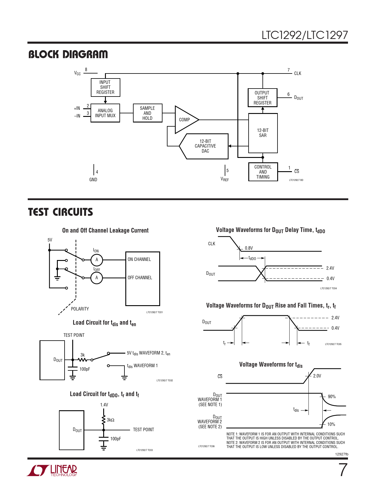 LTC1292/LTC1297 WBLOCK ID AGRA 8 7 VCC CLK INPUT SHIFT REGISTER OUTPUT 6 SHIFT DOUT REGISTER 2 +IN SAMPLE ANALOG 3 AND –IN INPUT MUX HOLD COMP 12-BIT SAR 12-BIT CAPACITIVE DAC CONTROL 1 5 4 AND CS TIMING V GND REF LTC1292/7 BD TEST CIRCUITSOn and Off Channel Leakage CurrentVoltage Waveforms for DOUT Delay Time, tdDO 5V CLK I 0.8V ON A ON CHANNEL tdDO IOFF 2.4V DOUT A OFF CHANNEL 0.4V LTC1292/7 TC04 Voltage Waveforms for DOUT Rise and Fall Times, tr, tf POLARITY LTC1292/7 TC01 2.4V Load Circuit for t D dis and ten OUT 0.4V TEST POINT tr tf LTC1292/7 TC05 5V t 3k dis WAVEFORM 2, ten DOUT t Voltage Waveforms for t dis WAVEFORM 1 dis 100pF CS 2.0V LTC1292/7 TC02 Load Circuit for tdDO, tr and tf DOUT 90% WAVEFORM 1 1.4V (SEE NOTE 1) tdis DOUT 3kΩ WAVEFORM 2 10% (SEE NOTE 2) DOUT TEST POINT NOTE 1: WAVEFORM 1 IS FOR AN OUTPUT WITH INTERNAL CONDITIONS SUCH 100pF THAT THE OUTPUT IS HIGH UNLESS DISABLED BY THE OUTPUT CONTROL. NOTE 2: WAVEFORM 2 IS FOR AN OUTPUT WITH INTERNAL CONDITIONS SUCH LTC1292/7 TC06 THAT THE OUTPUT IS LOW UNLESS DISABLED BY THE OUTPUT CONTROL. LTC1292/7 TC03 12927fb 7