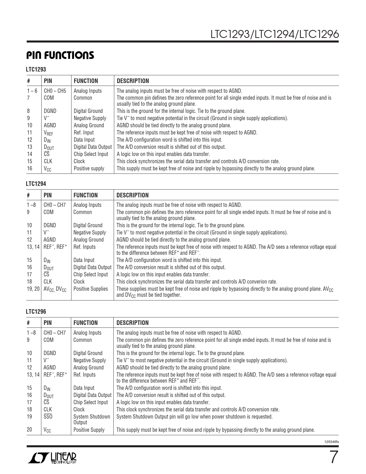 LTC1293/LTC1294/LTC1296 UUUPI FU CTIO SLTC1293#PINFUNCTIONDESCRIPTION 1 – 6 CH0 – CH5 Analog Inputs The analog inputs must be free of noise with respect to AGND. 7 COM Common The common pin defines the zero reference point for all single ended inputs. It must be free of noise and is usually tied to the analog ground plane. 8 DGND Digital Ground This is the ground for the internal logic. Tie to the ground plane. 9 V– Negative Supply Tie V– to most negative potential in the circuit (Ground in single supply applications). 10 AGND Analog Ground AGND should be tied directly to the analog ground plane. 11 VREF Ref. Input The reference inputs must be kept free of noise with respect to AGND. 12 DIN Data Input The A/D configuration word is shifted into this input. 13 DOUT Digital Data Output The A/D conversion result is shifted out of this output. 14 CS Chip Select Input A logic low on this input enables data transfer. 15 CLK Clock This clock synchronizes the serial data transfer and controls A/D conversion rate. 16 VCC Positive supply This supply must be kept free of noise and ripple by bypassing directly to the analog ground plane. LTC1294#PINFUNCTIONDESCRIPTION 1 –8 CH0 – CH7 Analog Inputs The analog inputs must be free of noise with respect to AGND. 9 COM Common The common pin defines the zero reference point for all single ended inputs. It must be free of noise and is usually tied to the analog ground plane. 10 DGND Digital Ground This is the ground for the internal logic. Tie to the ground plane. 11 V– Negative Supply Tie V– to most negative potential in the circuit (Ground in single supply applications). 12 AGND Analog Ground AGND should be tied directly to the analog ground plane. 13, 14 REF–, REF+ Ref. Inputs The reference inputs must be kept free of noise with respect to AGND. The A/D sees a reference voltage equal to the difference between REF+ and REF–. 15 DIN Data Input The A/D configuration word is shifted into this input. 16 DOUT Digital Data Output The A/D conversion result is shifted out of this output. 17 CS Chip Select Input A logic low on this input enables data transfer. 18 CLK Clock This clock synchronizes the serial data transfer and controls A/D converion rate. 19, 20 AVCC, DVCC Positive Supplies These supplies must be kept free of noise and ripple by bypassing directly to the analog ground plane. AVCC and DVCC must be tied together. LTC1296#PINFUNCTIONDESCRIPTION 1 –8 CH0 – CH7 Analog Inputs The analog inputs must be free of noise with respect to AGND. 9 COM Common The common pin defines the zero reference point for all single ended inputs. It must be free of noise and is usually tied to the analog ground plane. 10 DGND Digital Ground This is the ground for the internal logic. Tie to the ground plane. 11 V– Negative Supply Tie V– to most negative potential in the circuit (Ground in single supply applications). 12 AGND Analog Ground AGND should be tied directly to the analog ground plane. 13, 14 REF–, REF+ Ref. Inputs The reference inputs must be kept free of noise with respect to AGND. The A/D sees a reference voltage equal to the difference between REF+ and REF–. 15 DIN Data Input The A/D configuration word is shifted into this input. 16 DOUT Digital Data Output The A/D conversion result is shifted out of this output. 17 CS Chip Select Input A logic low on this input enables data transfer. 18 CLK Clock This clock synchronizes the serial data transfer and controls A/D conversion rate. 19 SSO System Shutdown System Shutdown Output pin will go low when power shutdown is requested. Output 20 VCC Positive Supply This supply must be kept free of noise and ripple by bypassing directly to the analog ground plane. 129346fs 7