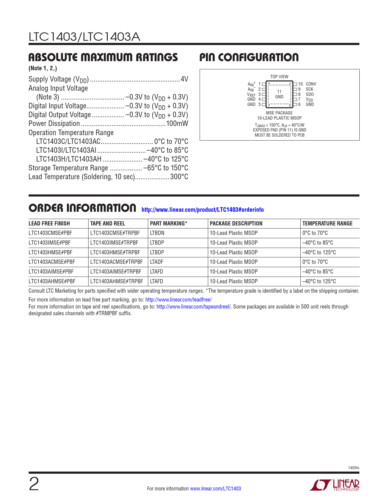 LTC1403/LTC1403A aBsolute maximum ratingspin conFiguration(Note 1, 2,) Supply Voltage (V TOP VIEW DD) ..4V + Analog Input Voltage AIN 1 10 CONV A – IN 2 9 SCK 11 (Note 3) ... –0.3V to (V VREF 3 8 SDO DD + 0.3V) GND 4 GND 7 VDD Digital Input Voltage... –0.3V to (VDD + 0.3V) GND 5 6 GND Digital Output Voltage .. –0.3V to (VDD + 0.3V) MSE PACKAGE 10-LEAD PLASTIC MSOP Power Dissipation ...100mW TJMAX = 150°C, qJA = 40°C/W Operation Temperature Range EXPOSED PAD (PIN 11) IS GND MUST BE SOLDERED TO PCB LTC1403C/LTC1403AC ... 0°C to 70°C LTC1403I/LTC1403AI ...–40°C to 85°C LTC1403H/LTC1403AH .. –40°C to 125°C Storage Temperature Range .. –65°C to 150°C Lead Temperature (Soldering, 10 sec) ...300°C orDer inFormation http://www.linear.com/product/LTC1403#orderinfoLEAD FREE FINISHTAPE AND REELPART MARKING*PACKAGE DESCRIPTIONTEMPERATURE RANGE LTC1403CMSE#PBF LTC1403CMSE#TRPBF LTBDN 10-Lead Plastic MSOP 0°C to 70°C LTC1403IMSE#PBF LTC1403IMSE#TRPBF LTBDP 10-Lead Plastic MSOP –40°C to 85°C LTC1403HMSE#PBF LTC1403HMSE#TRPBF LTBDP 10-Lead Plastic MSOP –40°C to 125°C LTC1403ACMSE#PBF LTC1403ACMSE#TRPBF LTADF 10-Lead Plastic MSOP 0°C to 70°C LTC1403AIMSE#PBF LTC1403AIMSE#TRPBF LTAFD 10-Lead Plastic MSOP –40°C to 85°C LTC1403AHMSE#PBF LTC1403AHMSE#TRPBF LTAFD 10-Lead Plastic MSOP –40°C to 125°C Consult LTC Marketing for parts specified with wider operating temperature ranges. *The temperature grade is identified by a label on the shipping container. For more information on lead free part marking, go to: http://www.linear.com/leadfree/ For more information on tape and reel specifications, go to: http://www.linear.com/tapeandreel/. Some packages are available in 500 unit reels through designated sales channels with #TRMPBF suffix. 1403fc 2 For more information www.linear.com/LTC1403 Document Outline Features Applications Block Diagram Description Absolute Maximum Ratings Order Information Pin Configuration Converter Characteristics Analog Input Dynamic Accuracy Internal Reference Characteristics Digital Inputs and Digital Outputs Power Requirements Timing Characteristics Typical Performance Characteristics Pin Functions Block Diagram Timing Diagram Applications Information Package Description Revision History Related Parts
