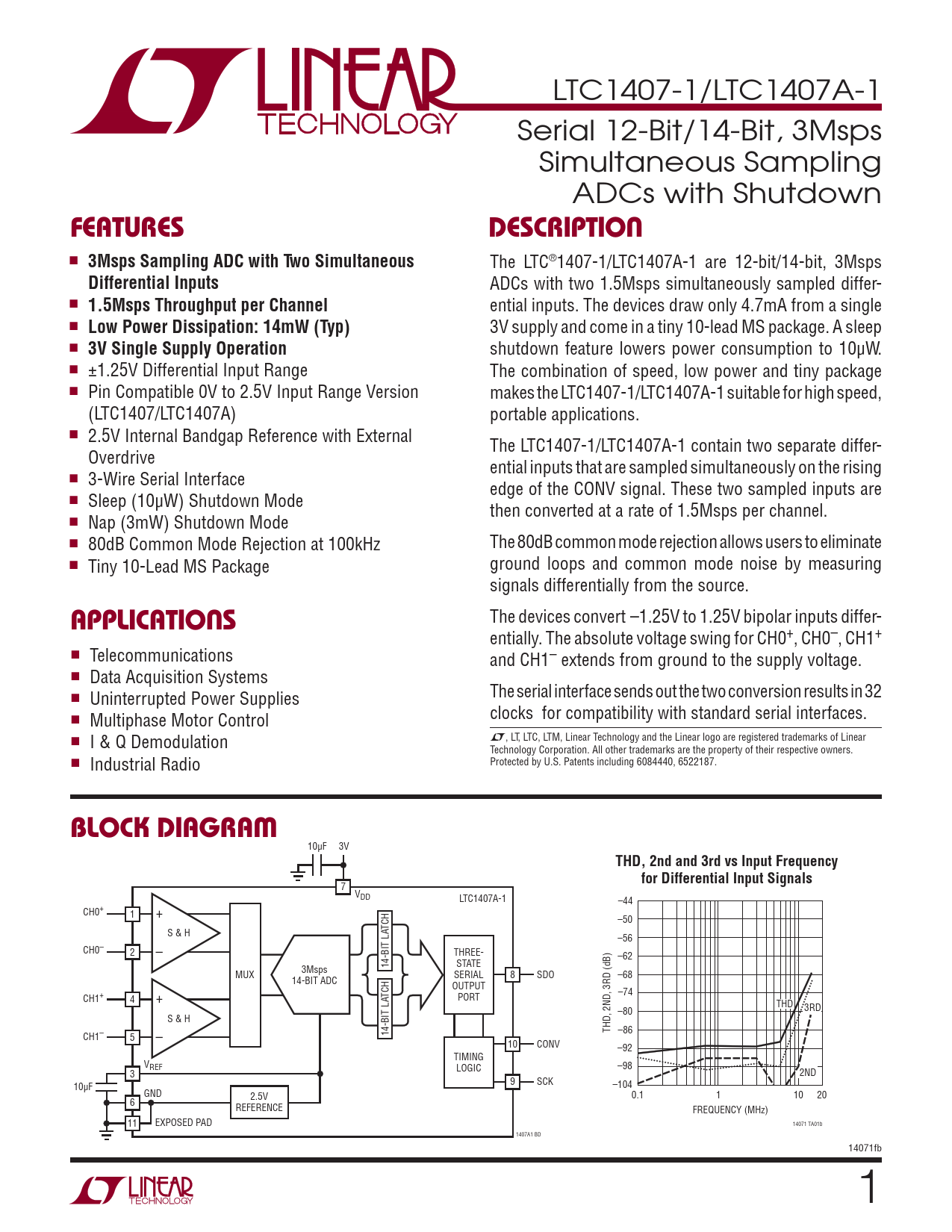 LTC1407-1/LTC1407A-1 Serial 12-Bit/14-Bit, 3Msps Simultaneous Sampling ADCs with Shutdown FEATURESDESCRIPTION n 3Msps Sampling ADC with Two Simultaneous The LTC®1407-1/LTC1407A-1 are 12-bit/14-bit, 3Msps Differential Inputs ADCs with two 1.5Msps simultaneously sampled differ- n 1.5Msps Throughput per Channel ential inputs. The devices draw only 4.7mA from a single n Low Power Dissipation: 14mW (Typ) 3V supply and come in a tiny 10-lead MS package. A sleep n 3V Single Supply Operation shutdown feature lowers power consumption to 10μW. n ±1.25V Differential Input Range The combination of speed, low power and tiny package n Pin Compatible 0V to 2.5V Input Range Version makes the LTC1407-1/LTC1407A-1 suitable for high speed, (LTC1407/LTC1407A) portable applications. n 2.5V Internal Bandgap Reference with External The LTC1407-1/LTC1407A-1 contain two separate differ- Overdrive ential inputs that are sampled simultaneously on the rising n 3-Wire Serial Interface edge of the CONV signal. These two sampled inputs are n Sleep (10μW) Shutdown Mode then converted at a rate of 1.5Msps per channel. n Nap (3mW) Shutdown Mode n 80dB Common Mode Rejection at 100kHz The 80dB common mode rejection allows users to eliminate n Tiny 10-Lead MS Package ground loops and common mode noise by measuring signals differentially from the source. The devices convert –1.25V to 1.25V bipolar inputs differ- APPLICATIONS entially. The absolute voltage swing for CH0+, CH0–, CH1+ n Telecommunications and CH1– extends from ground to the supply voltage. n Data Acquisition Systems The serial interface sends out the two conversion results in 32 n Uninterrupted Power Supplies clocks for compatibility with standard serial interfaces. n Multiphase Motor Control L, LT, LTC, LTM, Linear Technology and the Linear logo are registered trademarks of Linear n I & Q Demodulation Technology Corporation. All other trademarks are the property of their respective owners. n Protected by U.S. Patents including 6084440, 6522187. Industrial Radio BLOCK DIAGRAM 10μF 3V THD, 2nd and 3rd vs Input Frequencyfor Differential Input Signals 7 VDD LTC1407A-1 –44 CH0+ 1 + –50 TCH S & H –56 CH0– 2 – THREE- –62 14-BIT LA STATE 3Msps MUX SERIAL 8 SDO –68 14-BIT ADC OUTPUT –74 CH1+ TCH 4 + PORT THD –80 3RD S & H THD, 2ND, 3RD (dB) –86 CH1– 14-BIT LA 5 – 10 CONV –92 TIMING VREF LOGIC –98 3 2ND 9 SCK 10μF –104 GND 2.5V 0.1 1 10 20 6 REFERENCE FREQUENCY (MHz) 11 EXPOSED PAD 14071 TA01b 1407A1 BD 14071fb 1