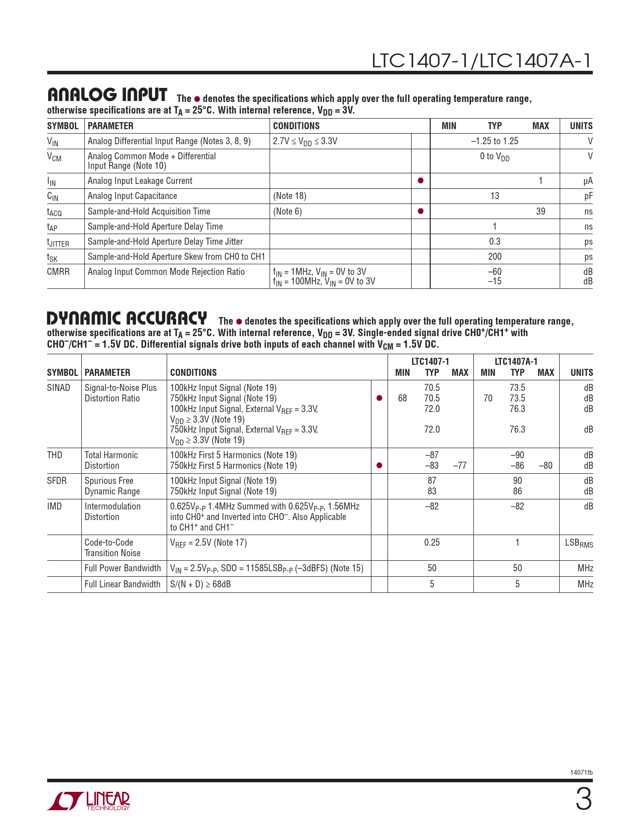 LTC1407-1/LTC1407A-1 TheANALOG INPUT l denotes the specifi cations which apply over the full operating temperature range,otherwise specifi cations are at TA = 25°C. With internal reference, VDD = 3V. SYMBOL PARAMETERCONDITIONSMINTYPMAXUNITS VIN Analog Differential Input Range (Notes 3, 8, 9) 2.7V ≤ VDD ≤ 3.3V –1.25 to 1.25 V VCM Analog Common Mode + Differential 0 to VDD V Input Range (Note 10) IIN Analog Input Leakage Current l 1 μA CIN Analog Input Capacitance (Note 18) 13 pF tACQ Sample-and-Hold Acquisition Time (Note 6) l 39 ns tAP Sample-and-Hold Aperture Delay Time 1 ns tJITTER Sample-and-Hold Aperture Delay Time Jitter 0.3 ps tSK Sample-and-Hold Aperture Skew from CH0 to CH1 200 ps CMRR Analog Input Common Mode Rejection Ratio fIN = 1MHz, VIN = 0V to 3V –60 dB fIN = 100MHz, VIN = 0V to 3V –15 dB DYNAMIC ACCURACYThe l denotes the specifi cations which apply over the full operating temperature range,otherwise specifi cations are at TA = 25°C. With internal reference, VDD = 3V. Single-ended signal drive CH0+/CH1+ withCHO–/CH1– = 1.5V DC. Differential signals drive both inputs of each channel with VCM = 1.5V DC.LTC1407-1LTC1407A-1SYMBOL PARAMETERCONDITIONSMINTYPMAXMINTYPMAXUNITS SINAD Signal-to-Noise Plus 100kHz Input Signal (Note 19) 70.5 73.5 dB Distortion Ratio 750kHz Input Signal (Note 19) l 68 70.5 70 73.5 dB 100kHz Input Signal, External VREF = 3.3V, 72.0 76.3 dB VDD ≥ 3.3V (Note 19) 750kHz Input Signal, External VREF = 3.3V, 72.0 76.3 dB VDD ≥ 3.3V (Note 19) THD Total Harmonic 100kHz First 5 Harmonics (Note 19) –87 –90 dB Distortion 750kHz First 5 Harmonics (Note 19) l –83 –77 –86 –80 dB SFDR Spurious Free 100kHz Input Signal (Note 19) 87 90 dB Dynamic Range 750kHz Input Signal (Note 19) 83 86 dB IMD Intermodulation 0.625VP-P 1.4MHz Summed with 0.625VP-P, 1.56MHz –82 –82 dB Distortion into CH0+ and Inverted into CHO–. Also Applicable to CH1+ and CH1– Code-to-Code VREF = 2.5V (Note 17) 0.25 1 LSBRMS Transition Noise Full Power Bandwidth VIN = 2.5VP-P, SDO = 11585LSBP-P (–3dBFS) (Note 15) 50 50 MHz Full Linear Bandwidth S/(N + D) ≥ 68dB 5 5 MHz 14071fb 3