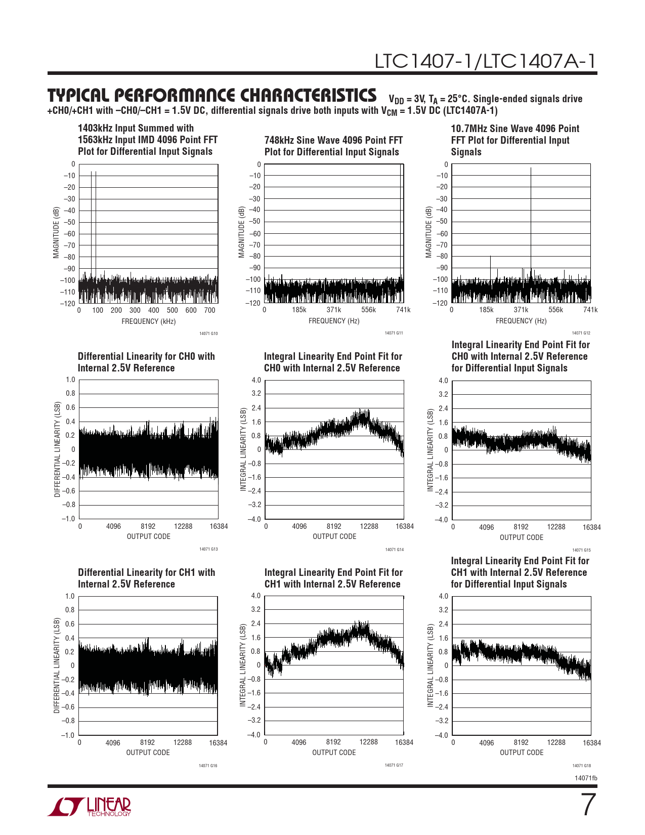 TYPICAL PERFORMANCE CHARACTERISTICS VDD = 3V, TA = 25°C. Single-ended signals drive +CH0/+CH1 with –CH0/–CH1 = 1.5V DC, differential signals drive both inputs with VCM = 1.5V DC (LTC1407A-1) 1403kHz Input Summed with 10.7MHz Sine Wave 4096 Point 1563kHz Input IMD 4096 Point FFT 748kHz Sine Wave 4096 Point FFT FFT Plot for Differential Input Plot for Differential Input Signals Plot for Differential Input Signals Signals
