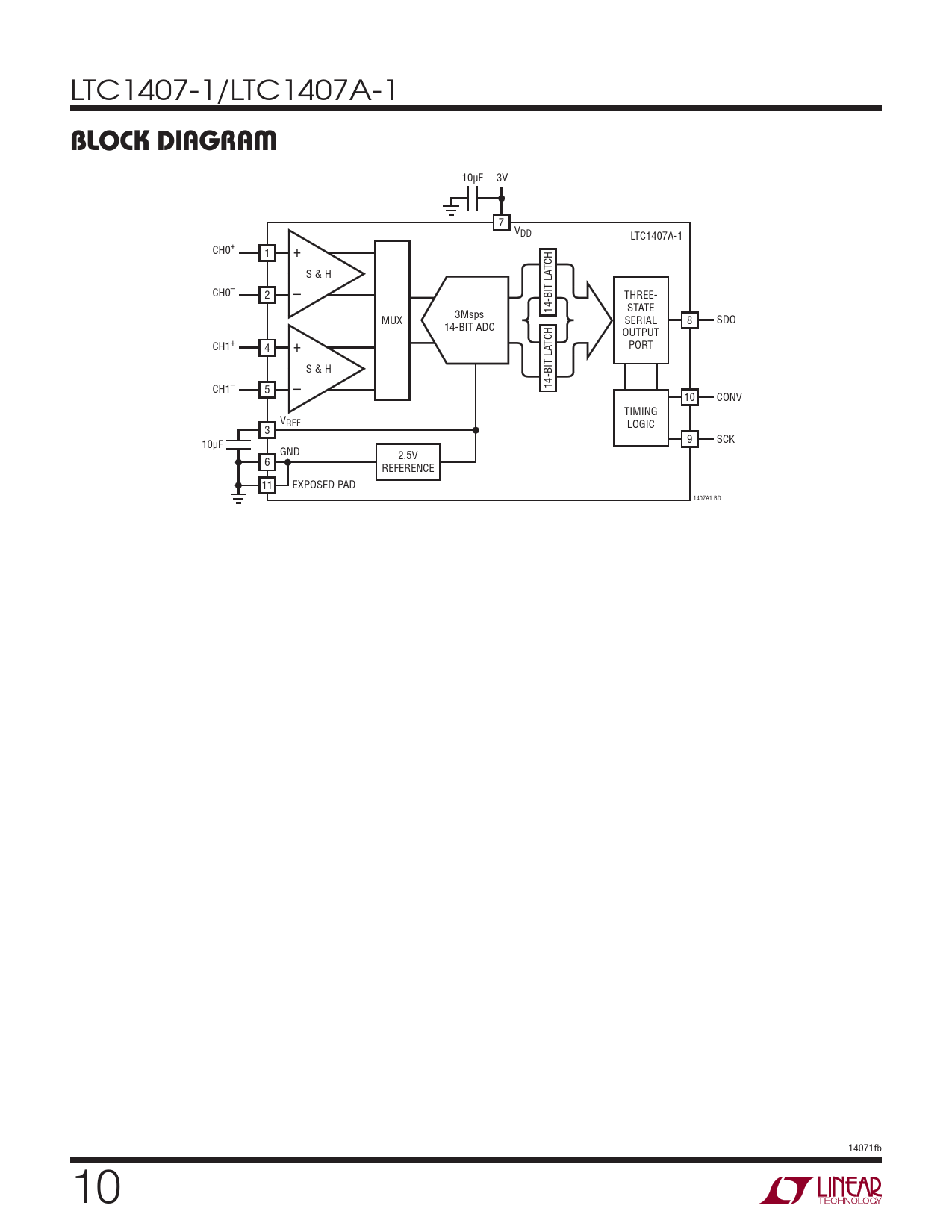 10μF 3V 7 VDD LTC1407A-1 CH0+ 1 + TCH S & H CH0– 2 – THREE- 14-BIT LA STATE 3Msps MUX SERIAL 8 SDO 14-BIT ADC OUTPUT CH1+ TCH 4 + PORT S & H CH1– 14-BIT LA 5 – 10 CONV TIMING VREF LOGIC 3 9 SCK 10μF GND 2.5V 6 REFERENCE 11 EXPOSED PAD 1407A1 BD 14071fb 10