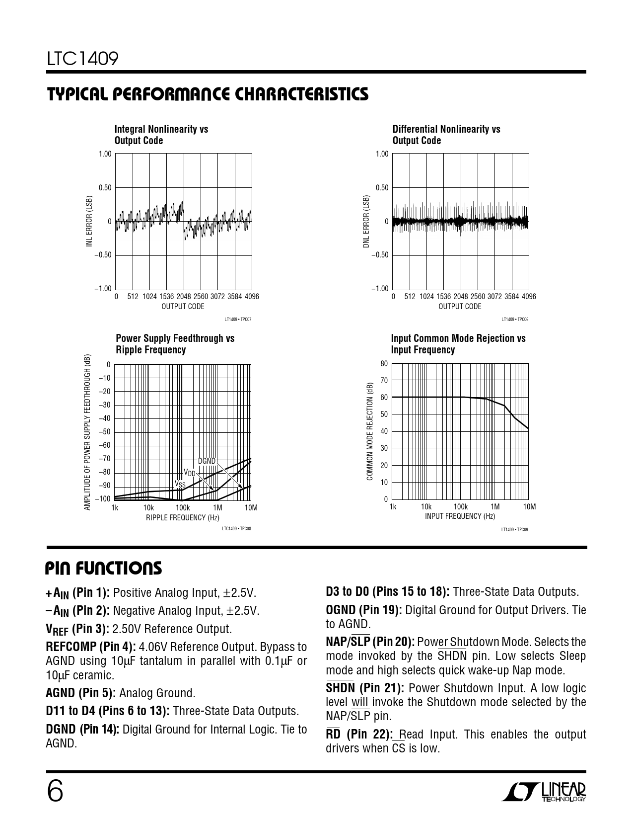1.00 1.00 0.50 0.50 0 0 INL ERROR (LSB) DNL ERROR (LSB) –0.50 –0.50 –1.00 –1.00 0 512 1024 1536 2048 2560 3072 3584 4096 0 512 1024 1536 2048 2560 3072 3584 4096 OUTPUT CODE OUTPUT CODE LT1409 • TPC07 LT1409 • TPC06