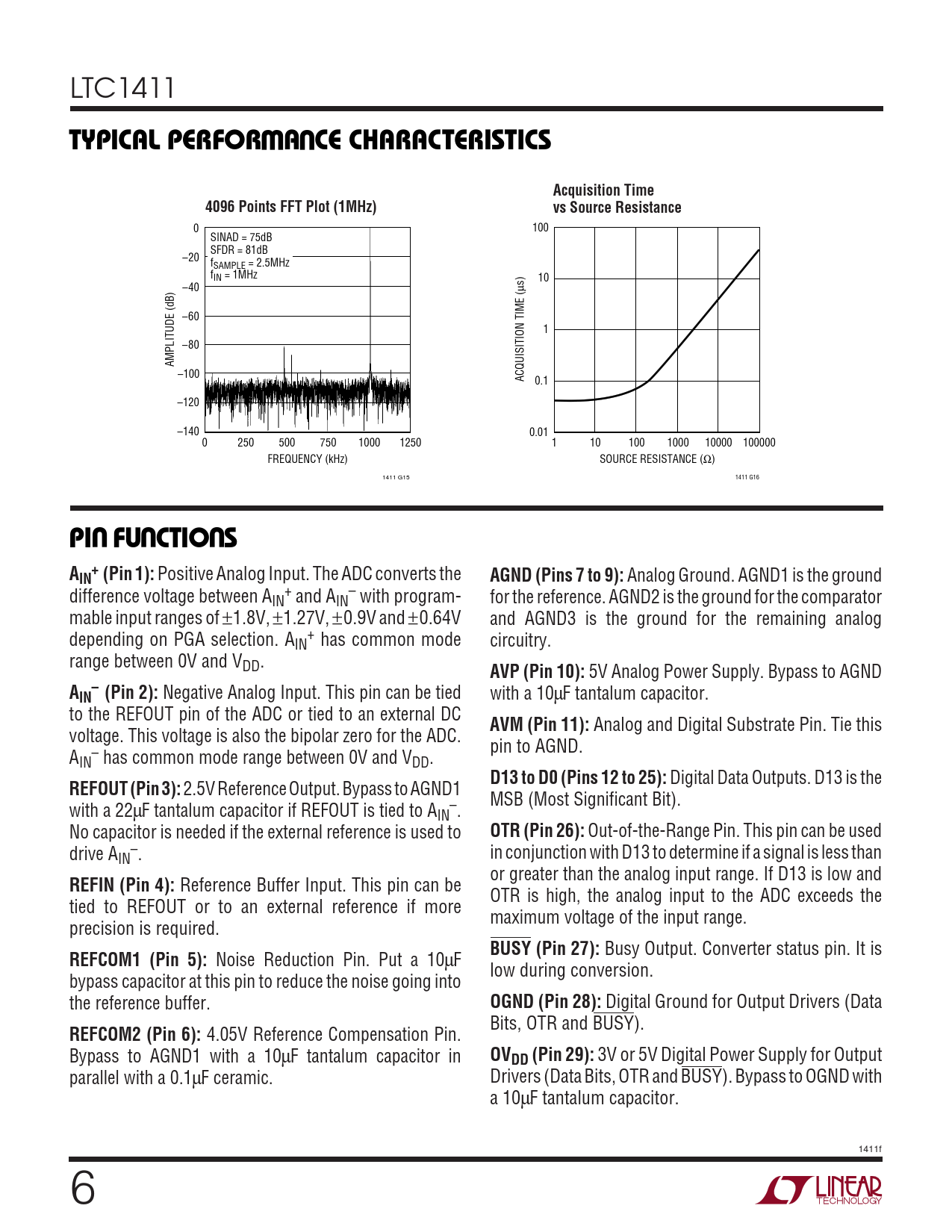 0 100 SINAD = 75dB SFDR = 81dB –20 fSAMPLE = 2.5MHz fIN = 1MHz 10 –40 µs) –60 1 –80 AMPLITUDE (dB) –100 ACQUISITION TIME ( 0.1 –120 –140 0.01 0 250 500 750 1000 1250 1 10 100 1000 10000 100000 FREQUENCY (kHz) SOURCE RESISTANCE (Ω) 1411 G15 1411 G16