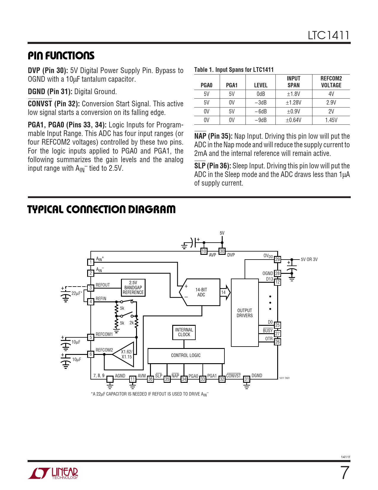 LTC1411 UUUPI FU CTIO SDVP (Pin 30): 5V Digital Power Supply Pin. Bypass to Table 1. Input Spans for LTC1411 OGND with a 10µF tantalum capacitor. INPUTREFCOM2PGA0PGA1LEVELSPANVOLTAGEDGND (Pin 31): Digital Ground. 5V 5V 0dB ±1.8V 4V CONVST (Pin 32): Conversion Start Signal. This active 5V 0V – 3dB ±1.28V 2.9V low signal starts a conversion on its falling edge. 0V 5V – 6dB ±0.9V 2V 0V 0V – 9dB ±0.64V 1.45V PGA1, PGA0 (Pins 33, 34): Logic Inputs for Program- mable Input Range. This ADC has four input ranges (or NAP (Pin 35): Nap Input. Driving this pin low will put the four REFCOM2 voltages) controlled by these two pins. ADC in the Nap mode and will reduce the supply current to For the logic inputs applied to PGA0 and PGA1, the 2mA and the internal reference will remain active. following summarizes the gain levels and the analog input range with A – SLP (Pin 36): Sleep Input. Driving this pin low will put the IN tied to 2.5V. ADC in the Sleep mode and the ADC draws less than 1µA of supply current. UUUWTYPICAL CO ECTIO DIAGRA 5V + 10 30 AVP DVP OV + DD AIN 29 5V OR 3V 1 + A – IN 2 OGND 28 D13 2.5V 12 REFOUT + 3 BANDGAP + 14-BIT 22 REFERENCE 14 µF* ADC REFIN – • 4 • 5k OUTPUT • DRIVERS 5k 2k D0 25 INTERNAL BUSY REFCOM1 CLOCK 27 + 5 OTR 10µF 26 REFCOM2 + X1.62/ 6 CONTROL LOGIC X1.15 10µF 7, 8, 9 AGND AVM SLP NAP PGA0 PGA1 CONVST DGND 1411 TA01 11 36 35 34 33 32 31 *A 22µF CAPACITOR IS NEEDED IF REFOUT IS USED TO DRIVE A – IN 1411f 7