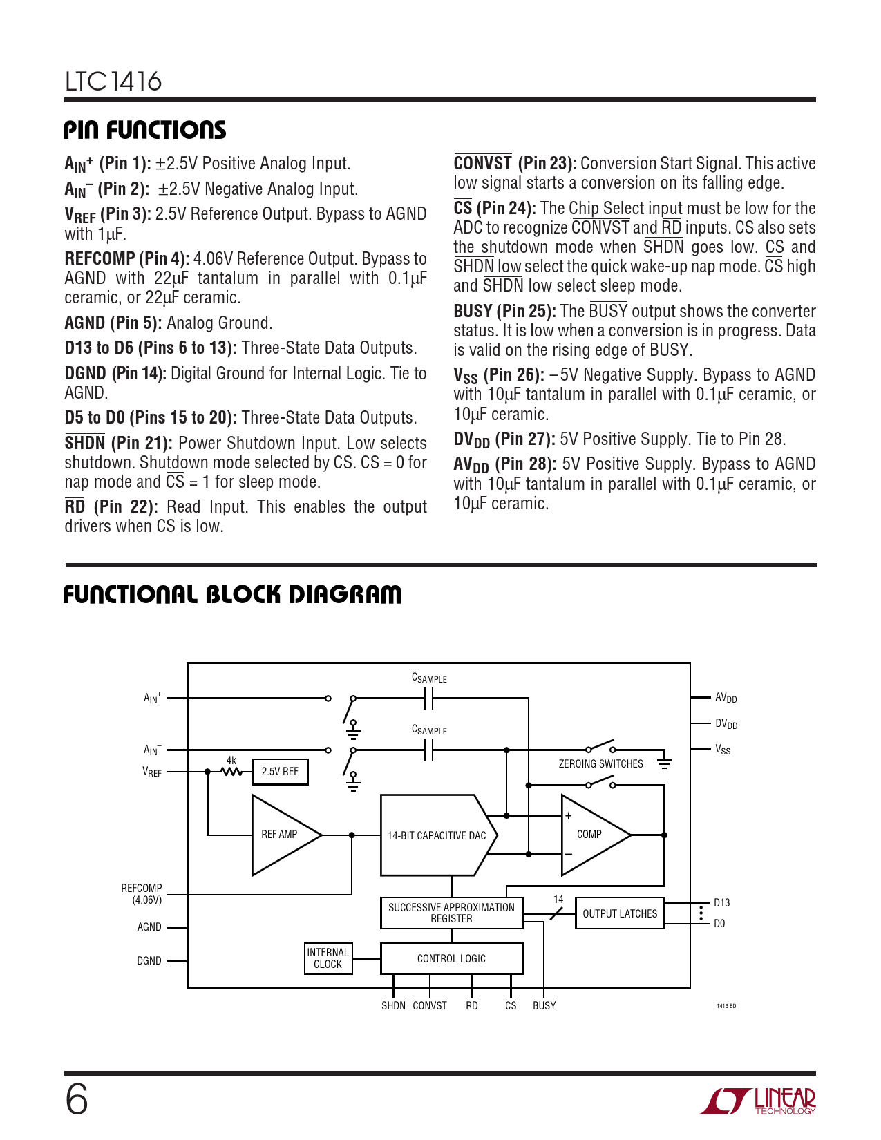 CSAMPLE A + AV IN DD DV C DD SAMPLE A – V IN SS 4k ZEROING SWITCHES VREF 2.5V REF + REF AMP 14-BIT CAPACITIVE DAC COMP – REFCOMP (4.06V) 14 SUCCESSIVE APPROXIMATION • D13 OUTPUT LATCHES • REGISTER • D0 AGND INTERNAL CONTROL LOGIC DGND CLOCK SHDN CONVST RD CS BUSY 1416 BD 6