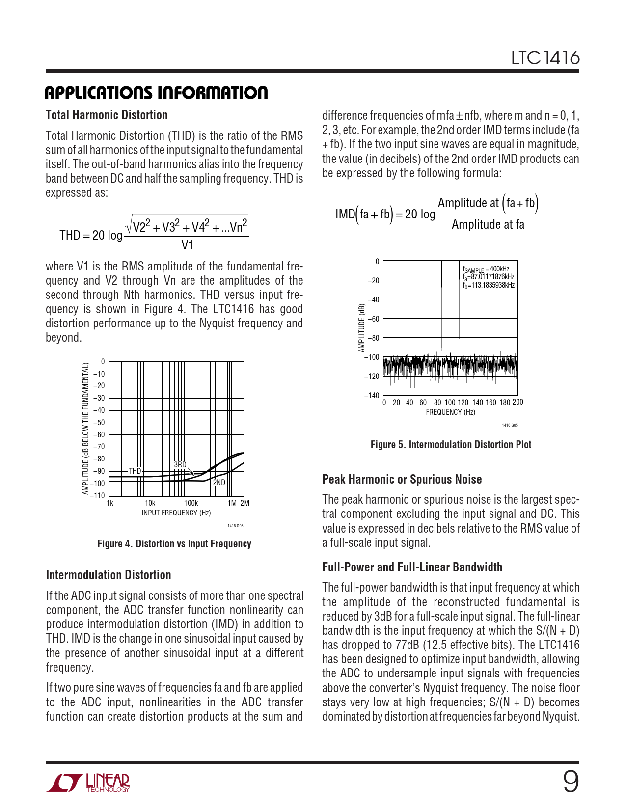 The full-power bandwidth is that input frequency at which If the ADC input signal consists of more than one spectral the amplitude of the reconstructed fundamental is component, the ADC transfer function nonlinearity can reduced by 3dB for a full-scale input signal. The full-linear produce intermodulation distortion (IMD) in addition to bandwidth is the input frequency at which the S/(N + D) THD. IMD is the change in one sinusoidal input caused by has dropped to 77dB (12.5 effective bits). The LTC1416 the presence of another sinusoidal input at a different has been designed to optimize input bandwidth, allowing frequency. the ADC to undersample input signals with frequencies If two pure sine waves of frequencies fa and fb are applied above the converter’s Nyquist frequency. The noise floor to the ADC input, nonlinearities in the ADC transfer stays very low at high frequencies; S/(N + D) becomes function can create distortion products at the sum and dominated by distortion at frequencies far beyond Nyquist. 9
