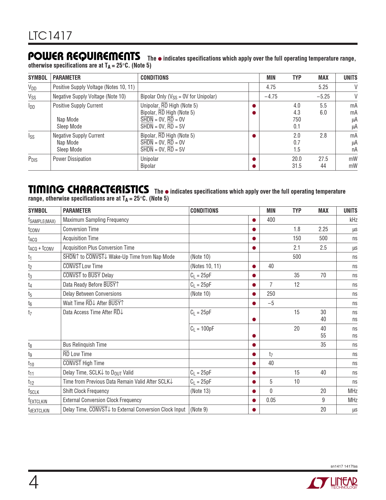 fSAMPLE(MAX) Maximum Sampling Frequency ● 400 kHz tCONV Conversion Time ● 1.8 2.25 µs tACQ Acquisition Time ● 150 500 ns tACQ + tCONV Acquisition Plus Conversion Time ● 2.1 2.5 µs t1 SHDN↑ to CONVST↓ Wake-Up Time from Nap Mode (Note 10) 500 ns t2 CONVST Low Time (Notes 10, 11) ● 40 ns t3 CONVST to BUSY Delay CL = 25pF ● 35 70 ns t4 Data Ready Before BUSY↑ CL = 25pF ● 7 12 ns t5 Delay Between Conversions (Note 10) ● 250 ns t6 Wait Time RD↓ After BUSY↑ ● – 5 ns t7 Data Access Time After RD↓ CL = 25pF 15 30 ns ● 40 ns CL = 100pF 20 40 ns ● 55 ns t8 Bus Relinquish Time ● 35 ns t9 RD Low Time ● t7 ns t10 CONVST High Time ● 40 ns t11 Delay Time, SCLK↓ to DOUT Valid CL = 25pF ● 15 40 ns t12 Time from Previous Data Remain Valid After SCLK↓ CL = 25pF ● 5 10 ns fSCLK Shift Clock Frequency (Note 13) ● 0 20 MHz fEXTCLKIN External Conversion Clock Frequency ● 0.05 9 MHz tdEXTCLKIN Delay Time, CONVST↓ to External Conversion Clock Input (Note 9) ● 20 µs sn1417 1417fas 4