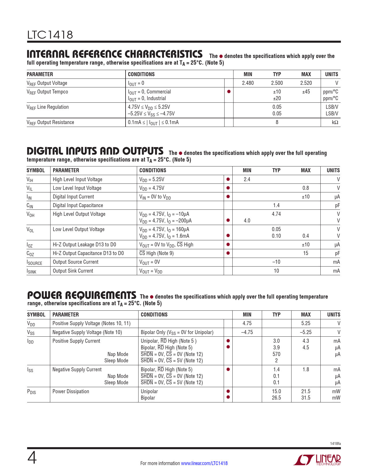 VDD Positive Supply Voltage (Notes 10, 11) 4.75 5.25 V VSS Negative Supply Voltage (Note 10) Bipolar Only (VSS = 0V for Unipolar) –4.75 –5.25 V IDD Positive Supply Current Unipolar, RD High (Note 5 ) l 3.0 4.3 mA Bipolar, RD High (Note 5) l 3.9 4.5 µA Nap Mode SHDN = 0V, CS = 0V (Note 12) 570 µA Sleep Mode SHDN = 0V, CS = 5V (Note 12) 2 ISS Negative Supply Current Bipolar, RD High (Note 5) l 1.4 1.8 mA Nap Mode SHDN = 0V, CS = 0V (Note 12) 0.1 µA Sleep Mode SHDN = 0V, CS = 5V (Note 12) 0.1 µA PDIS Power Dissipation Unipolar l 15.0 21.5 mW Bipolar l 26.5 31.5 mW 1418fa 4 For more information www.linear.com/LTC1418 Document Outline Features Applications Typical Application Description Absolute Maximum Ratings Order Information Package/Order Information Converter Characteristics Analog Input Dynamic Accuracy Internal Reference Characteristics Digital Inputs and Outputs Power Requirements Timing Characteristics Typical Performance Characteristics Pin Functions Test Circuit Block Diagram Applications Information Package Description Package Description Revision History Typical Application Related Parts