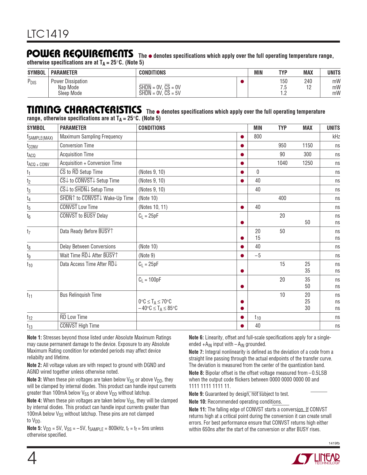 VDD = 5V, VSS = – 5V, fSAMPLE = 800kHz, tr = tf = 5ns unless within 650ns after the start of the conversion or after BUSY rises. otherwise specified. 1419fb 4
