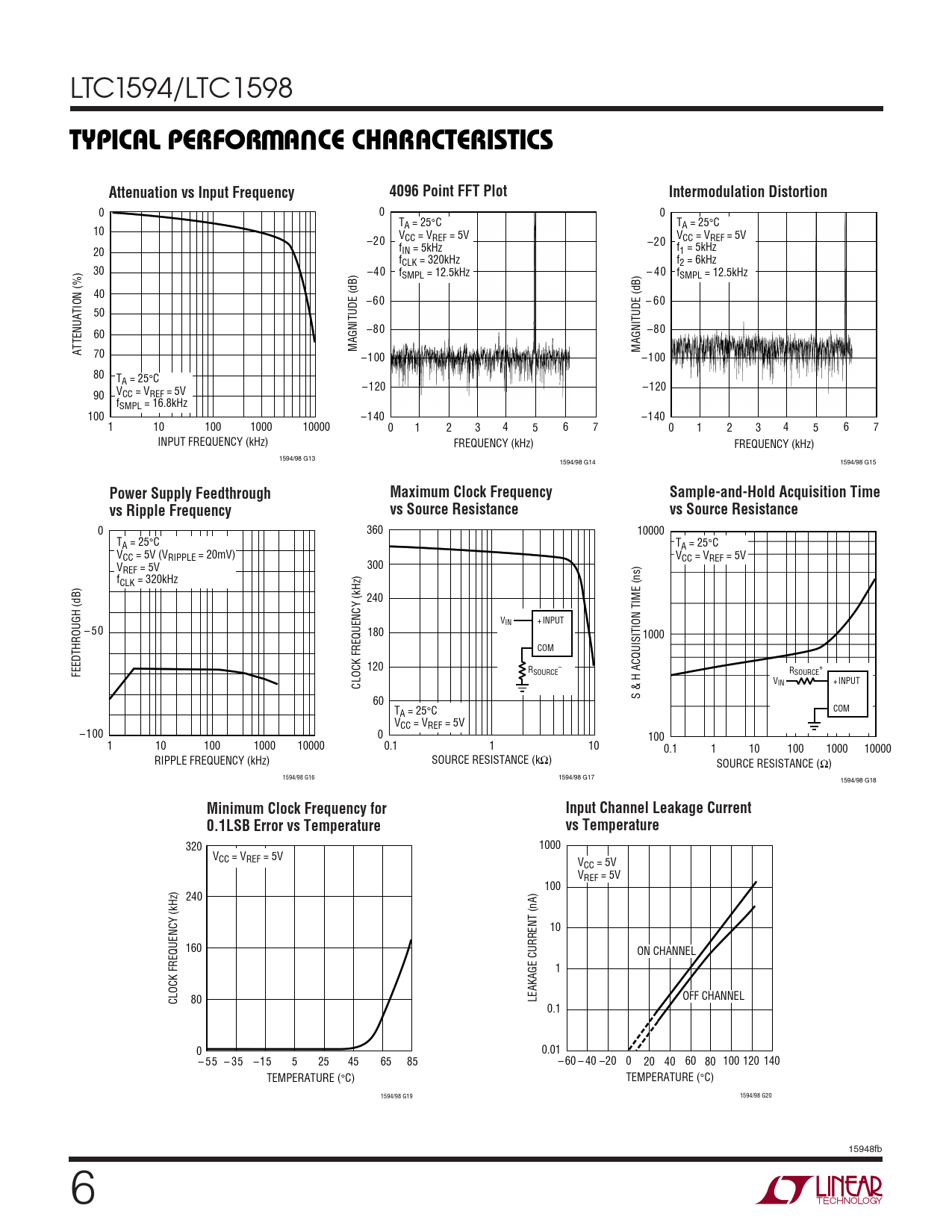 320 1000 VCC = VREF = 5V VCC = 5V VREF = 5V 100 240 10 160 ON CHANNEL 1 80 LEAKAGE CURRENT (nA) OFF CHANNEL CLOCK FREQUENCY (kHz) 0.1 0 0.01 – 55 – 35 –15 5 25 45 65 85 – 60 – 40 –20 0 20 40 60 80 100 120 140 TEMPERATURE (°C) TEMPERATURE (°C) 1594/98 G19 1594/98 G20 15948fb 6