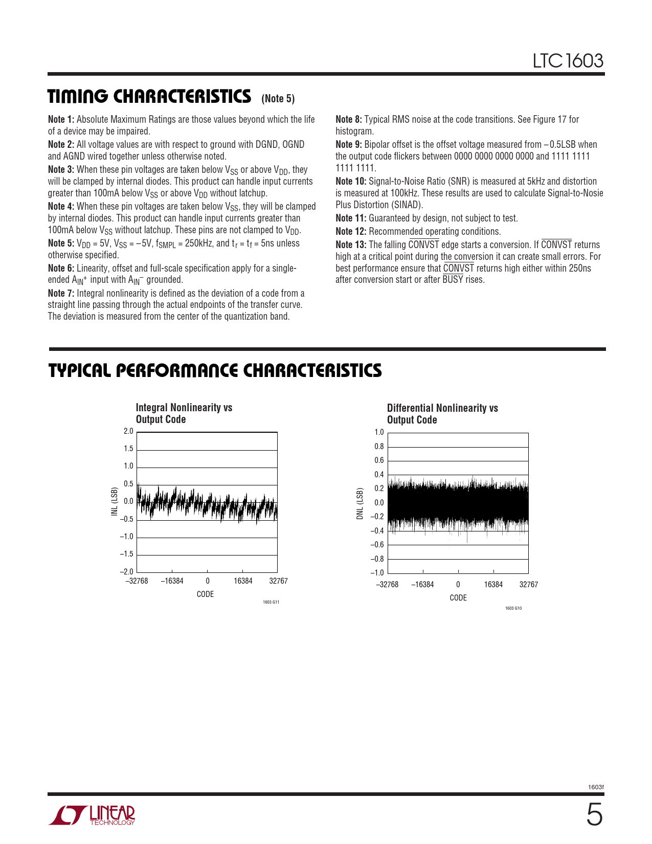 2.0 1.0 1.5 0.8 0.6 1.0 0.4 0.5 0.2 0.0 0.0 INL (LSB) –0.5 DNL (LSB) –0.2 –0.4 –1.0 –0.6 –1.5 –0.8 –2.0 –1.0 –32768 –16384 0 16384 32767 –32768 –16384 0 16384 32767 CODE CODE 1603 G11 1603 G10 1603f 5