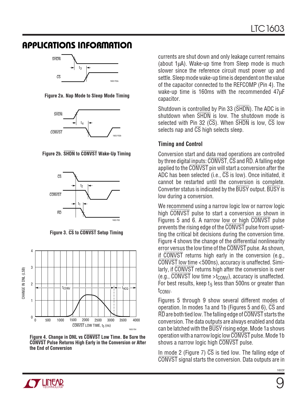 ting the critical bit decisions during the conversion time. Figure 4 shows the change of the differential nonlinearity error versus the low time of the CONVST pulse. As shown, 4 if CONVST returns high early in the conversion (e.g., CONVST low time <500ns), accuracy is unaffected. Simi- 3 larly, if CONVST returns high after the conversion is over (e.g., CONVST low time >tCONV), accuracy is unaffected. 2 For best results, keep t5 less than 500ns or greater than tCONV tACQ tCONV. CHANGE IN DNL (LSB) 1 Figures 5 through 9 show several different modes of operation. In modes 1a and 1b (Figures 5 and 6), CS and RD are both tied low. The falling edge of CONVST starts the 0 0 500 1000 1500 2000 2500 3000 3500 4000 conversion. The data outputs are always enabled and data CONVST LOW TIME, t5 (ns) 1603 F04 can be latched with the BUSY rising edge. Mode 1a shows