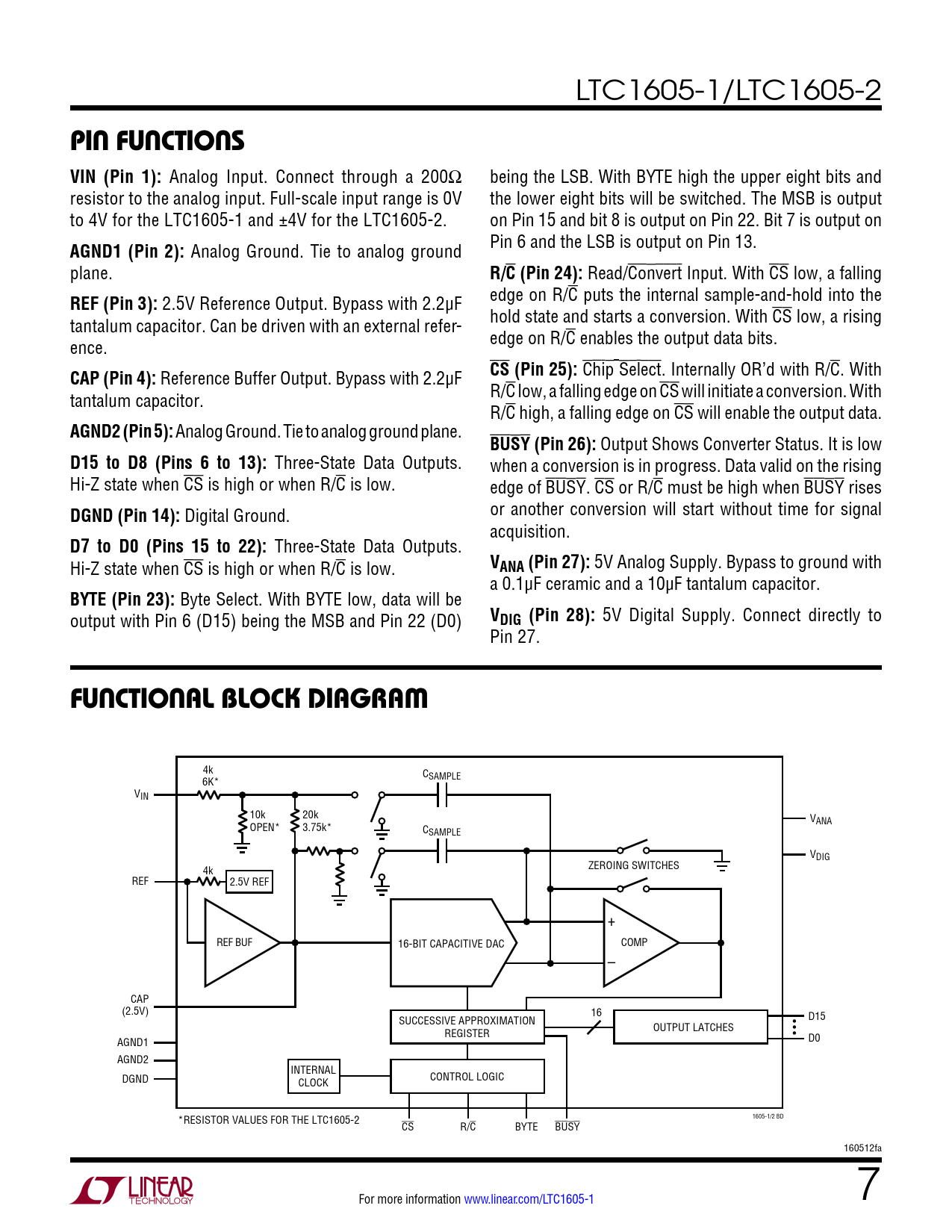 LTC1605-1/LTC1605-2 pin FuncTions VIN (Pin 1): Analog Input. Connect through a 200Ω being the LSB. With BYTE high the upper eight bits and resistor to the analog input. Full-scale input range is 0V the lower eight bits will be switched. The MSB is output to 4V for the LTC1605-1 and ±4V for the LTC1605-2. on Pin 15 and bit 8 is output on Pin 22. Bit 7 is output on AGND1 (Pin 2): Analog Ground. Tie to analog ground Pin 6 and the LSB is output on Pin 13. plane. R/C (Pin 24): Read/Convert Input. With CS low, a falling REF (Pin 3): 2.5V Reference Output. Bypass with 2.2µF edge on R/C puts the internal sample-and-hold into the tantalum capacitor. Can be driven with an external refer- hold state and starts a conversion. With CS low, a rising ence. edge on R/C enables the output data bits. CAP (Pin 4): Reference Buffer Output. Bypass with 2.2µF CS (Pin 25): Chip Select. Internally OR’d with R/C. With tantalum capacitor. R/C low, a falling edge on CS will initiate a conversion. With R/C high, a falling edge on CS will enable the output data. AGND2 (Pin 5): Analog Ground. Tie to analog ground plane. BUSY (Pin 26): Output Shows Converter Status. It is low D15 to D8 (Pins 6 to 13): Three-State Data Outputs. when a conversion is in progress. Data valid on the rising Hi-Z state when CS is high or when R/C is low. edge of BUSY. CS or R/C must be high when BUSY rises DGND (Pin 14): Digital Ground. or another conversion will start without time for signal acquisition. D7 to D0 (Pins 15 to 22): Three-State Data Outputs. Hi-Z state when CS is high or when R/C is low. VANA (Pin 27): 5V Analog Supply. Bypass to ground with a 0.1µF ceramic and a 10µF tantalum capacitor. BYTE (Pin 23): Byte Select. With BYTE low, data will be output with Pin 6 (D15) being the MSB and Pin 22 (D0) VDIG (Pin 28): 5V Digital Supply. Connect directly to Pin 27. FuncTional block DiagraM 4k CSAMPLE 6K* VIN 10k 20k VANA OPEN* 3.75k* CSAMPLE VDIG ZEROING SWITCHES 4k REF 2.5V REF + REF BUF 16-BIT CAPACITIVE DAC COMP – CAP (2.5V) 16 SUCCESSIVE APPROXIMATION • D15 • REGISTER OUTPUT LATCHES • D0 AGND1 AGND2 INTERNAL DGND CONTROL LOGIC CLOCK 1605-1/2 BD *RESISTOR VALUES FOR THE LTC1605-2 CS R/C BYTE BUSY 160512fa For more information www.linear.com/LTC1605-1 7