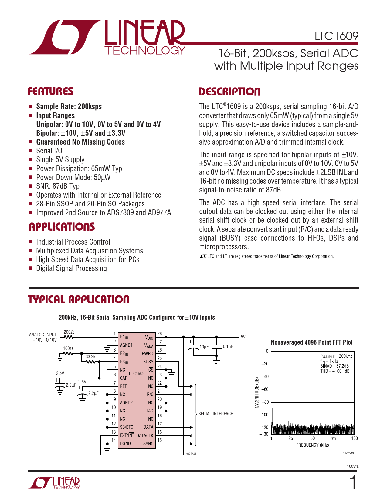 LTC1609 16-Bit, 200ksps, Serial ADC with Multiple Input Ranges UFEATURESDESCRIPTIO ■ Sample Rate: 200ksps The LTC®1609 is a 200ksps, serial sampling 16-bit A/D ■ Input Ranges converter that draws only 65mW (typical) from a single 5V Unipolar: 0V to 10V, 0V to 5V and 0V to 4V supply. This easy-to-use device includes a sample-and- Bipolar: ± 10V, ± 5V and ± 3.3V hold, a precision reference, a switched capacitor succes- ■ Guaranteed No Missing Codes sive approximation A/D and trimmed internal clock. ■ Serial I/O The input range is specified for bipolar inputs of ±10V, ■ Single 5V Supply ±5V and ±3.3V and unipolar inputs of 0V to 10V, 0V to 5V ■ Power Dissipation: 65mW Typ and 0V to 4V. Maximum DC specs include ±2LSB INL and ■ Power Down Mode: 50µW 16-bit no missing codes over temperature. It has a typical ■ SNR: 87dB Typ signal-to-noise ratio of 87dB. ■ Operates with Internal or External Reference ■ 28-Pin SSOP and 20-Pin SO Packages The ADC has a high speed serial interface. The serial ■ Improved 2nd Source to ADS7809 and AD977A output data can be clocked out using either the internal U serial shift clock or be clocked out by an external shift APPLICATIO S clock. A separate convert start input (R/C) and a data ready signal (BUSY) ease connections to FIFOs, DSPs and ■ Industrial Process Control microprocessors. ■ Multiplexed Data Acquisition Systems , LTC and LT are registered trademarks of Linear Technology Corporation. ■ High Speed Data Acquisition for PCs ■ Digital Signal Processing UTYPICAL APPLICATIO200kHz, 16-Bit Serial Sampling ADC Configured for ± 10V Inputs 200Ω 1 28 ANALOG INPUT R1IN VDIG 5V – 10V TO 10V 2 27 + Nonaveraged 4096 Point FFT Plot AGND1 VANA 10µF 0.1µF 100Ω 3 26 0 R2IN PWRD 33.2k f 4 25 SAMPLE = 200kHz R3IN BUSY f –20 IN = 1kHz 5 24 SINAD = 87.2dB NC CS THD = –100.1dB 2.5V 6 LTC1609 23 CAP NC + –40 2.5V 7 22 2.2µF REF NC + 8 21 –60 2.2µF NC R/C 9 20 AGND2 NC –80 10 19 MAGNITUDE (dB) NC TAG 11 18 SERIAL INTERFACE –100 NC NC 12 17 SB/BTC DATA –120 13 16 EXT/INT DATACLK –130 14 15 0 25 50 75 100 DGND SYNC FREQUENCY (kHz) 1609 TA01 1609 G06 1609fa 1