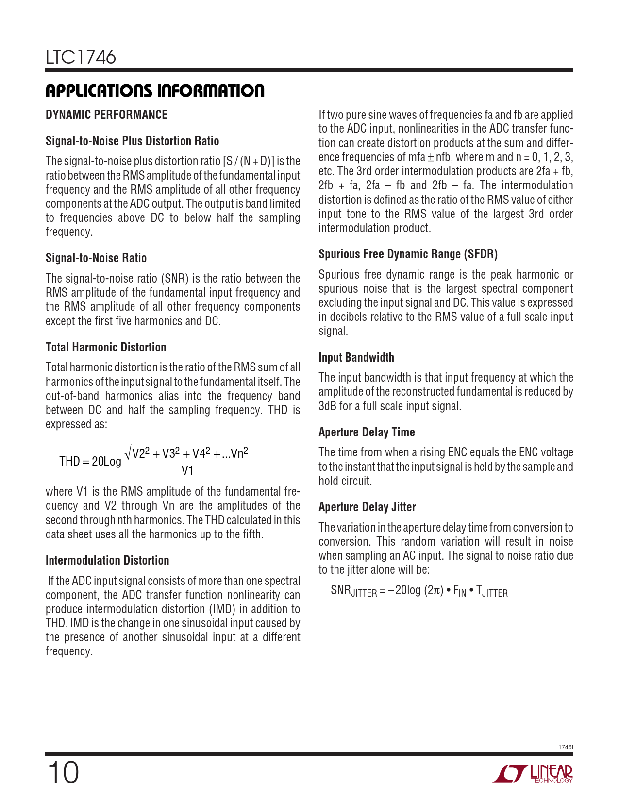 when sampling an AC input. The signal to noise ratio due to the jitter alone will be: If the ADC input signal consists of more than one spectral component, the ADC transfer function nonlinearity can SNRJITTER = –20log (2π) • FIN • TJITTER produce intermodulation distortion (IMD) in addition to THD. IMD is the change in one sinusoidal input caused by the presence of another sinusoidal input at a different frequency. 1746f 10